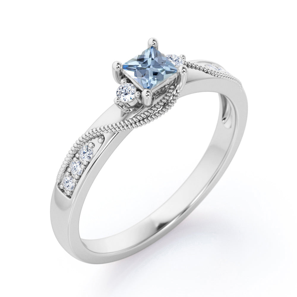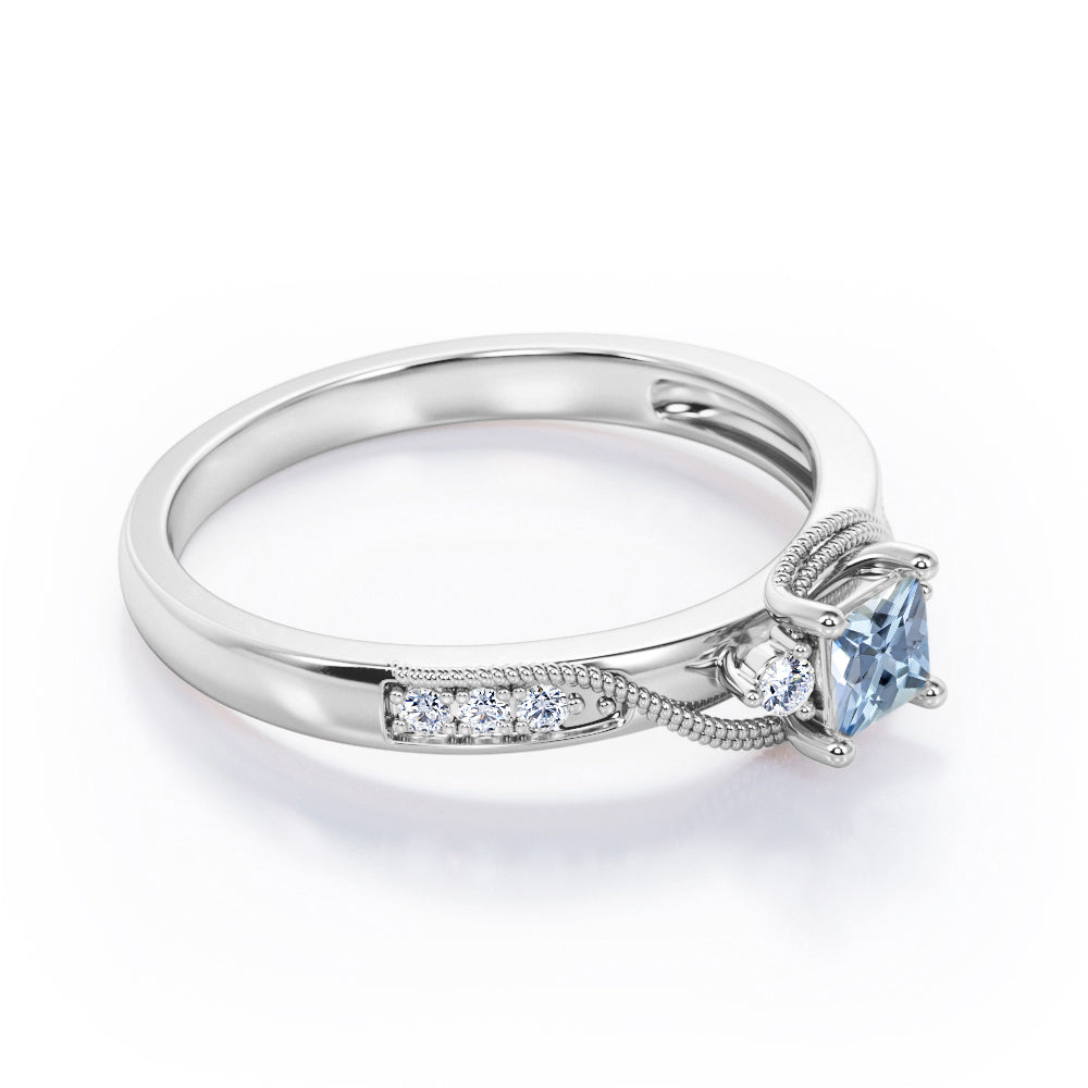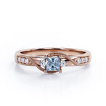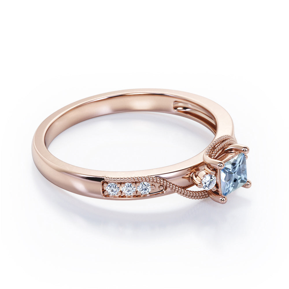 Double Curved Line Milgrain 0.55 carat Princess Aquamarine and Moissanite Dainty Engagement Ring in Rose Gold
