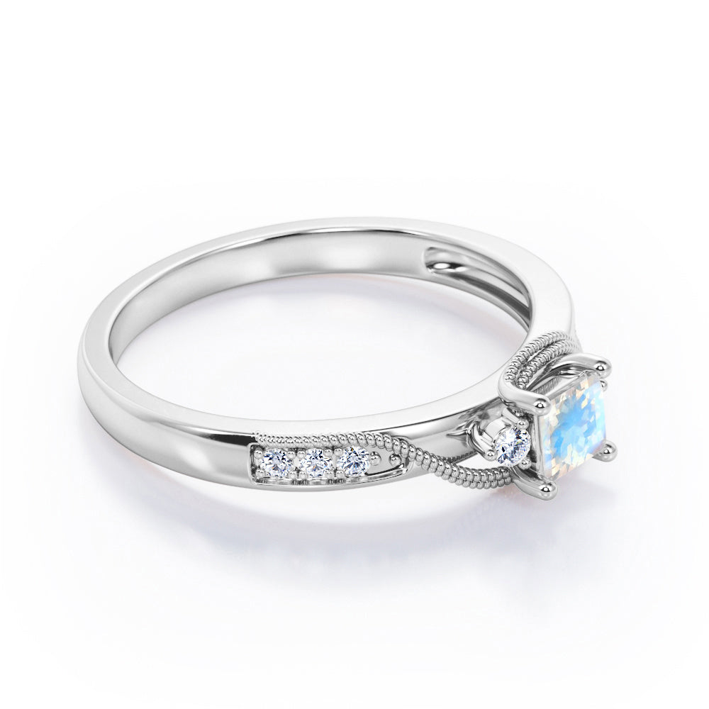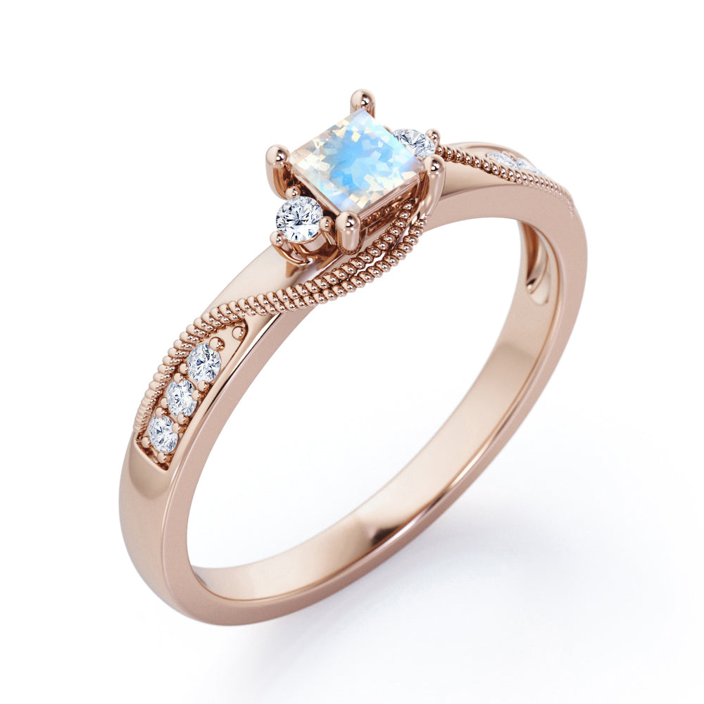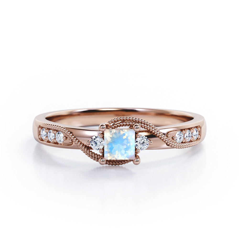 Double Curved Line Milgrain 0.55 carat Princess Moonstone and Moissanite Dainty Engagement Ring in rose Gold