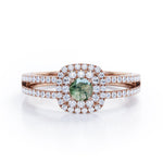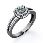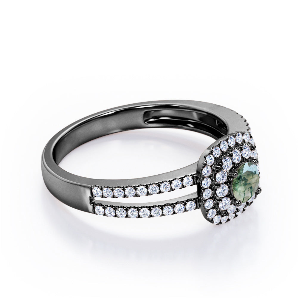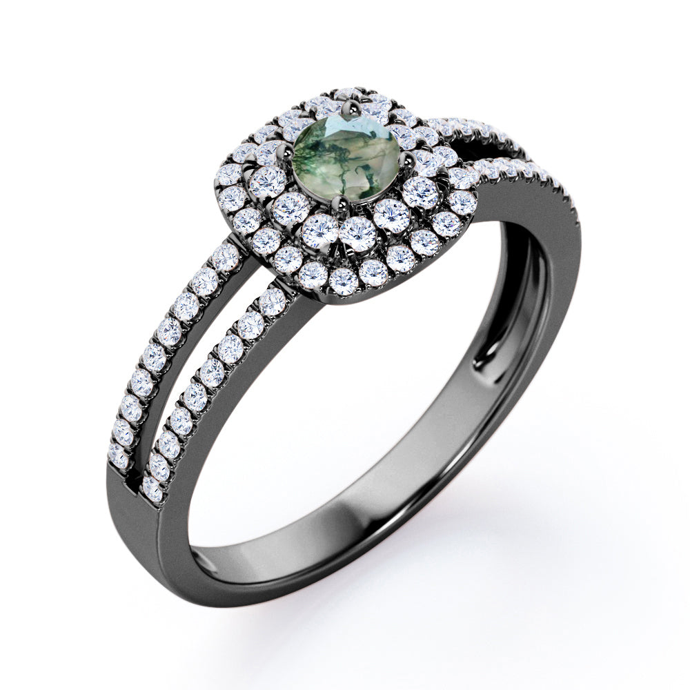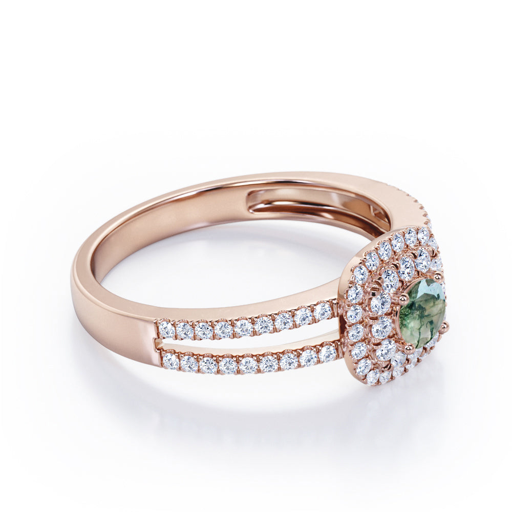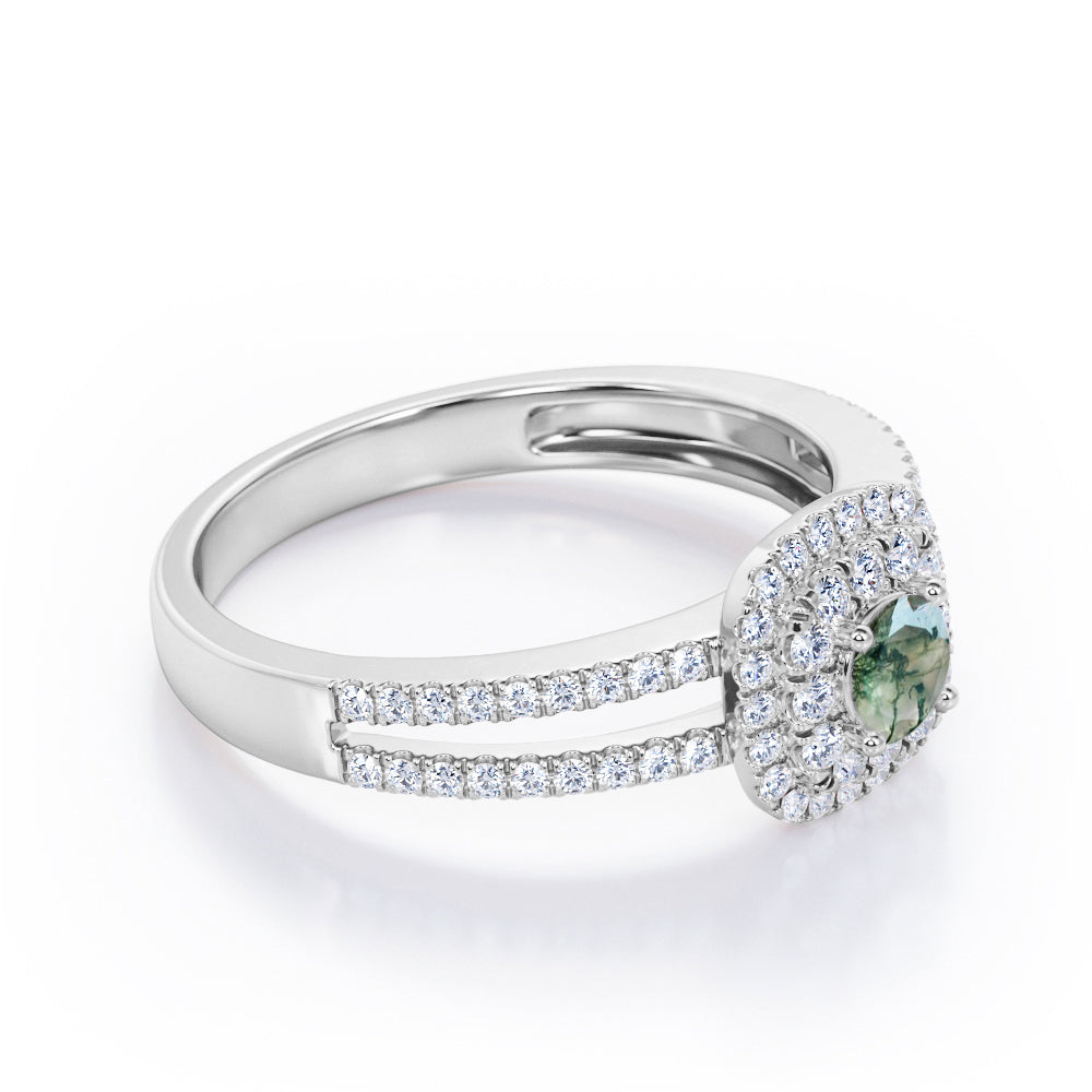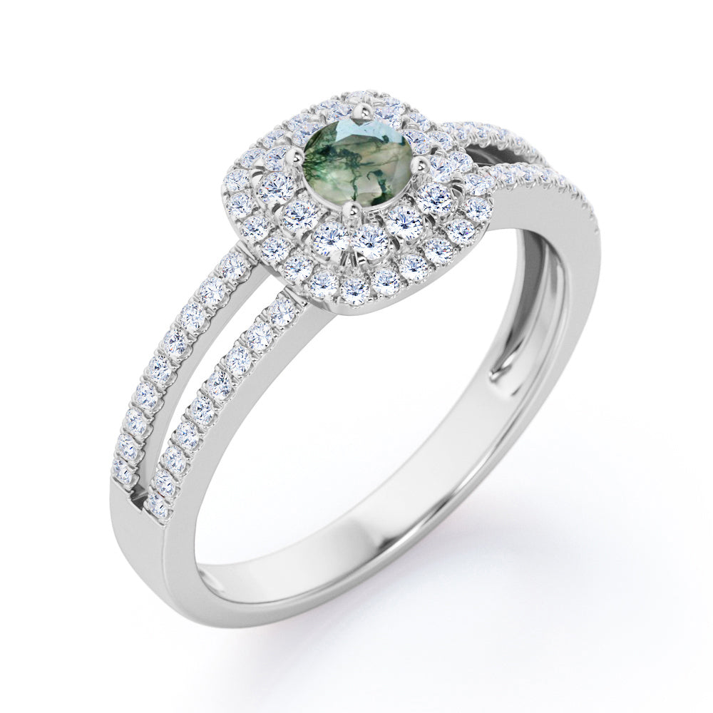 Double Halo 1.55 Carat Round Cut Green Moss Agate And Diamond Split Shank Engagement Ring In White Gold. An easy way to put a modern spin on a traditional engagement ring is to play with the stone's symmetry. This brilliant round cut green moss agate engagement ring features a 1 carat luscious green moss agate center stone in a double halo setting surrounded by 0.55 carat white diamonds which illuminates great brilliance and wonderful sparkle. An impressive and sparkling cushion framed double halo surrounds the center stone for a ring that will definitely stand out. The split shank in white gold band features pavé diamonds halfway around which adds more charm and value to this mesmerizing engagement ring. Handmade by our well-experienced artisans, this double halo 1.55 carat round cut green moss agate and diamond split shank engagement ring can also be customized to 18k Gold plating over silver, 10k Gold or 14k Gold as per your preference. Please note that if the ring is made over silver, the side stone will be moissanite and if it is made on gold, diamond will be employed as the side stone.