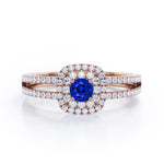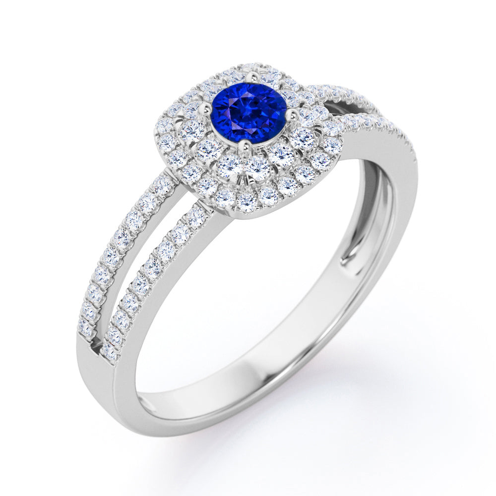 Double Halo 1.55 Carat Round Cut Sapphire And Diamond Split Shank Engagement Ring In Rose Gold. An easy way to put a modern spin on a traditional engagement ring is to play with the stone's symmetry. This brilliant round cut sapphire engagement ring features a 1 carat luscious Sapphire center stone in a double halo setting surrounded by 0.55 carat white diamonds which illuminates great brilliance and wonderful sparkle. An impressive and sparkling cushion framed double halo surrounds the center stone for a ring that will definitely stand out. The split shank in rose gold band features pavé diamonds halfway around which adds more charm and value to this mesmerizing engagement ring. Handmade by our well-experienced artisans, this double halo 1.55 carat round cut sapphire and diamond split shank engagement ring can also be customized to 18k Gold plating over silver, 10k Gold or 14k Gold as per your preference. Please note that if the ring is made over silver, the side stone will be moissanite and if it is made on gold, diamond will be employed as the side stone.