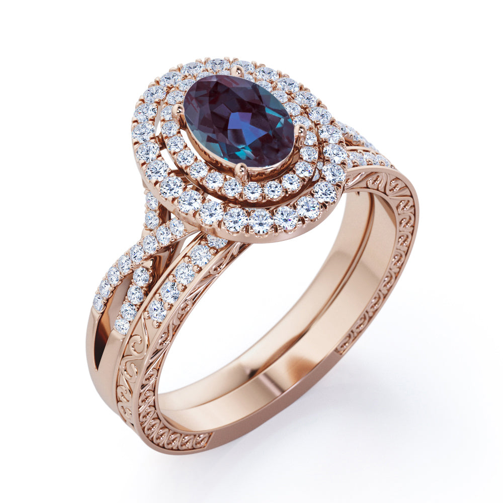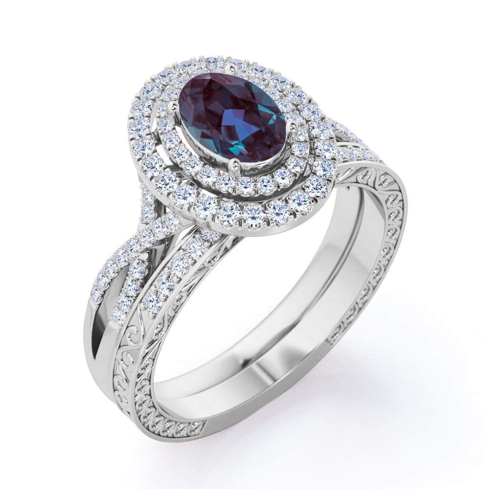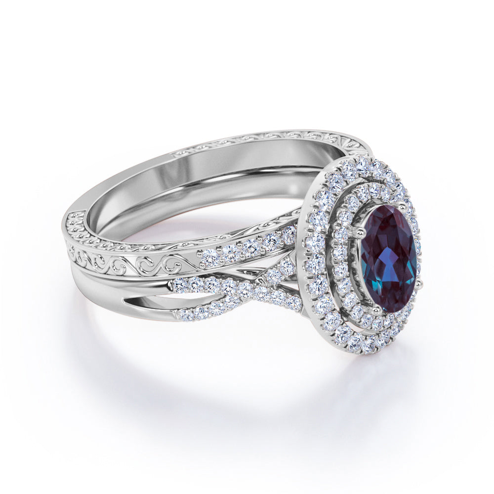 Double Halo 1.75 Carat Oval Cut Lab Created Alexandrite Infinity Wedding Ring Set In White Gold For Her. A wedding ring is forever, so you should choose one that continues to surprise and excite you even after years of wearing it daily. An alexandrite wedding ring checks that box and also symbolizes good luck and love. An oval cut 0.75 carat lab-created alexandrite surrounded by double halo diamonds gives a nod to a bygone era. The thick and bold shape of this infinity wedding ring set is sure to make a statement. Not only do the bands of this ring give a timeless aesthetic, but the alexandrite stone also makes the entire ring saturated in color. An oval alexandrite ring sits in the middle of a twisting band, surrounded by sizzling diamonds for plenty of sparkle. This vintage inspired double halo 1.75 carat oval cut lab created alexandrite infinity wedding set can also be customized to 18k Gold plating over silver, 10k Gold, 14k Gold or 18k Gold as per your choice by our well-experienced artisans.