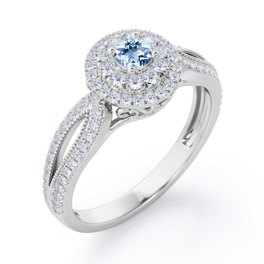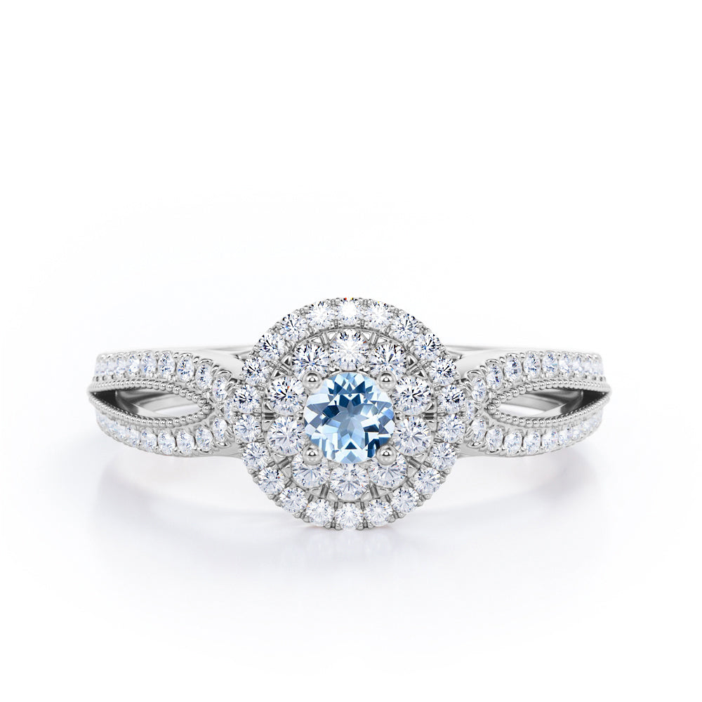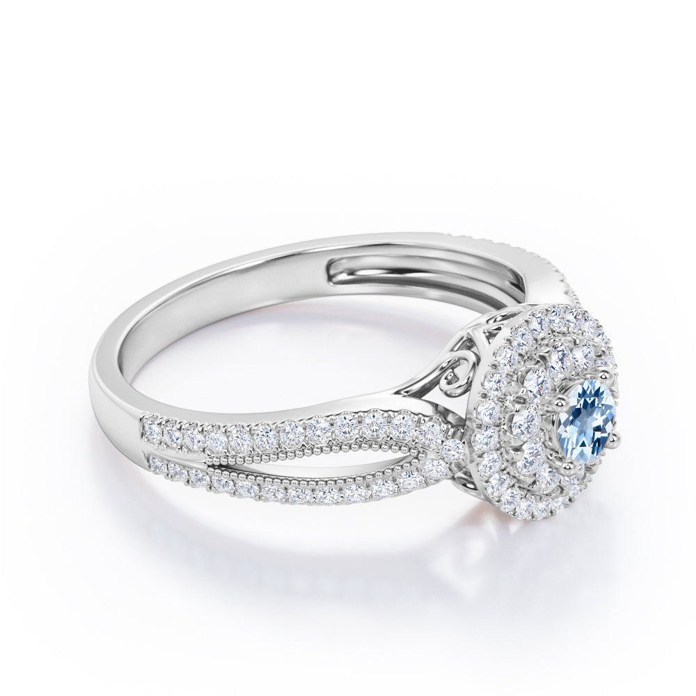 Double Halo Cluster 1.8 Carat Round-Shaped Aquamarine Split-Shaked Milgrain Pave Engagement Ring in White Gold