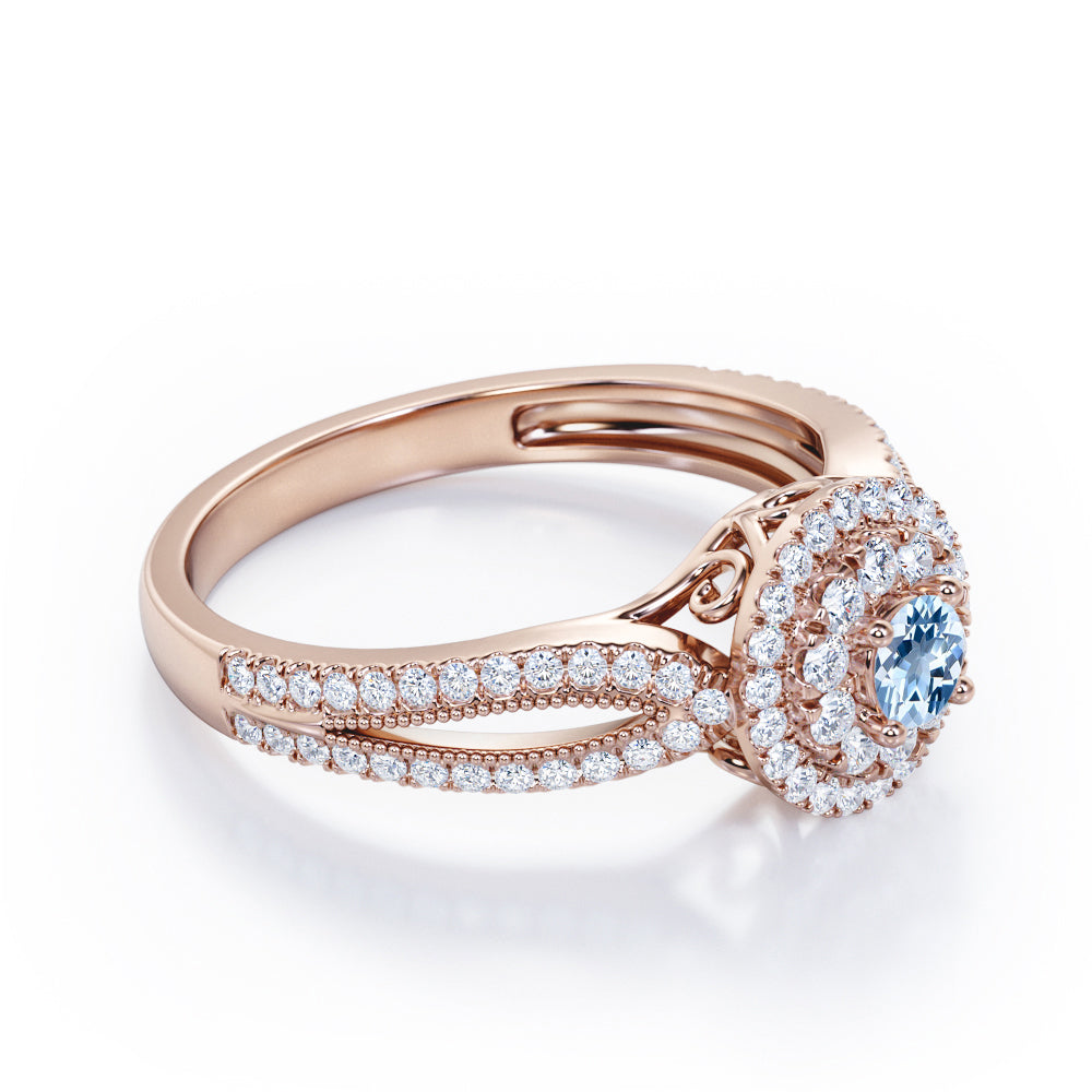 With this Double Halo Cluster 1.8 Carat Round-Shaped Aquamarine Split-Shaked Milgrain Pave Engagement Ring in White Gold, you can make your proposal day unforgettable. Handcrafted with care into a wonderful round cut by our lapidary expertise, this beautiful Aquamarine engagement ring is composed of a natural 1 carat round Aquamarine gemstone in the center with sparkling diamond side stones. Distinct and unusual, this gold Aquamarine ring for women is ideal for those who wish to express their charisma and uniqueness. This real Aquamarine ring for women is magnificent with its glory and brilliance and will be an unmistakable addition to any jewelry collection. Beautiful and affordable, this cheap engagement ring is stunning and inexpensive, thanks to its reasonable price. Our cheap engagement ring, the birthstone ring for the month of April, represents riches and extravagance and would make an excellent gift for friends or your better half. This affordable engagement ring can be customized, either in rose gold, white gold, black gold, or yellow gold, upon customer request. Let's show her how much you care by giving her this real Aquamarine ring for women.