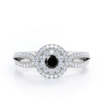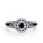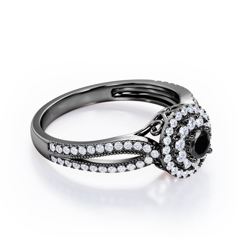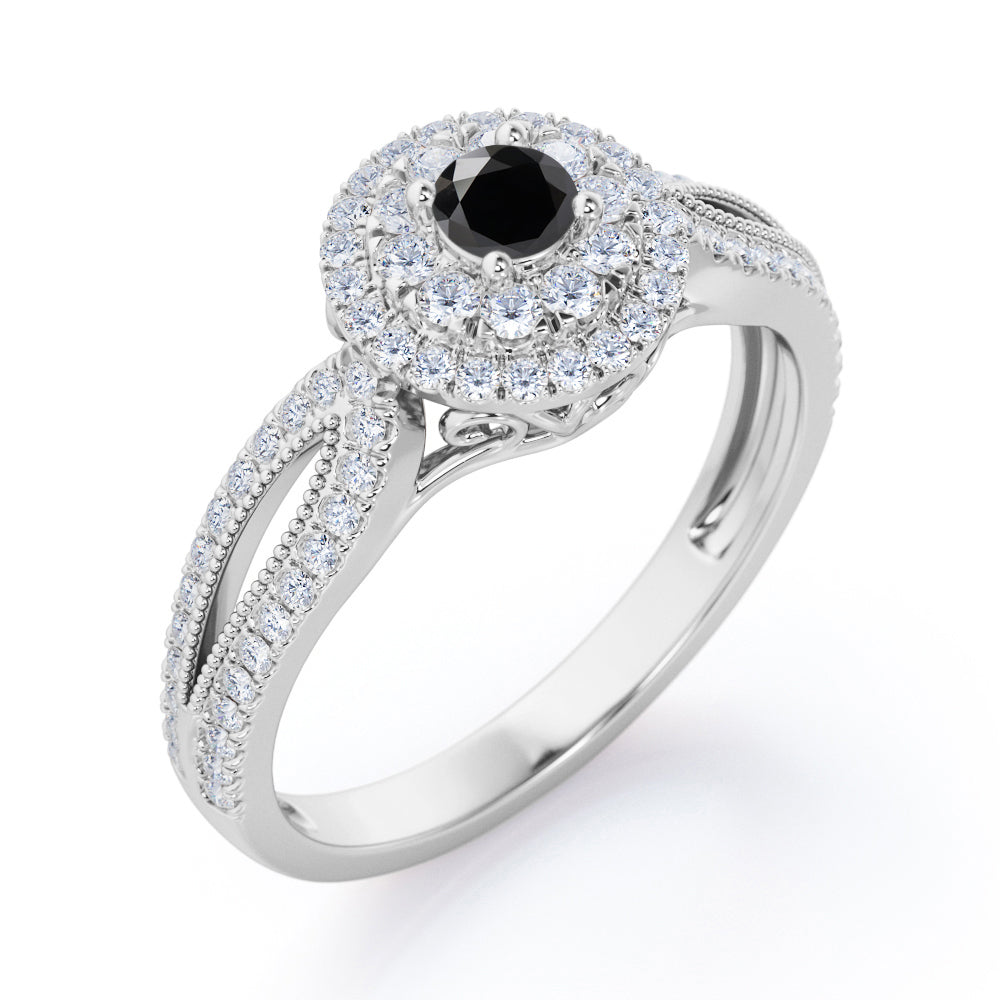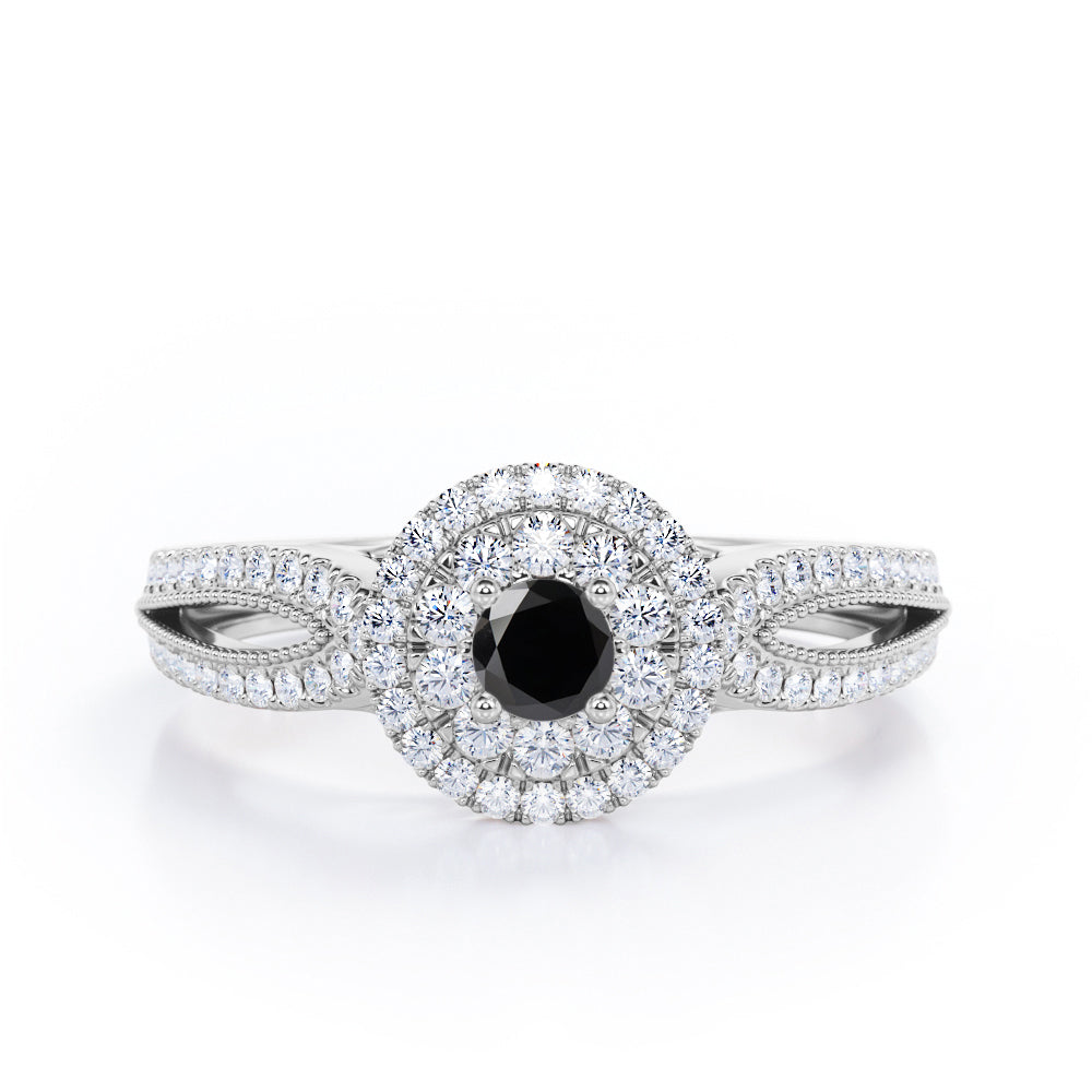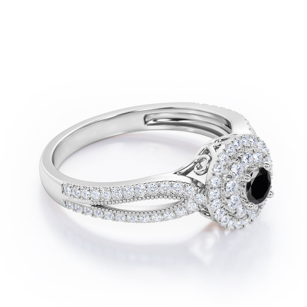 Double Halo Cluster 1.8 Carat Round-Shaped Black Diamond Split-Shaked Milgrain Pave Engagement Ring in White Gold