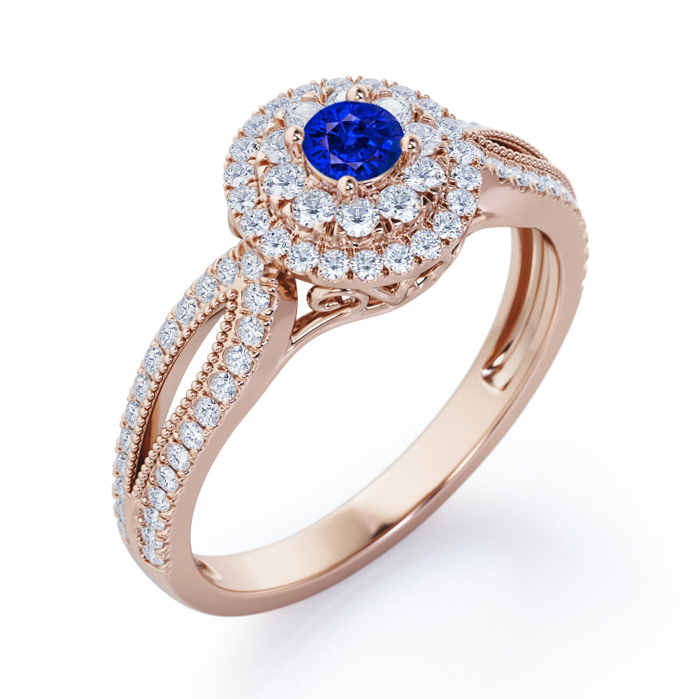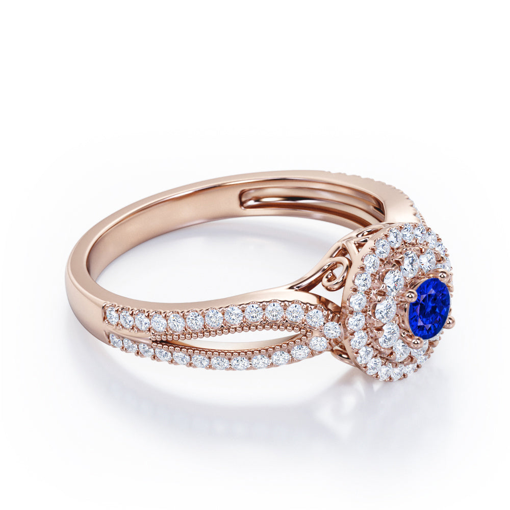 Double Halo Cluster 1.8 Carat Round-Shaped Blue Sapphire and diamond Split-Shaked Milgrain Pave Engagement Ring in White Gold