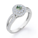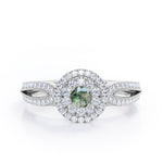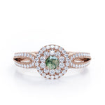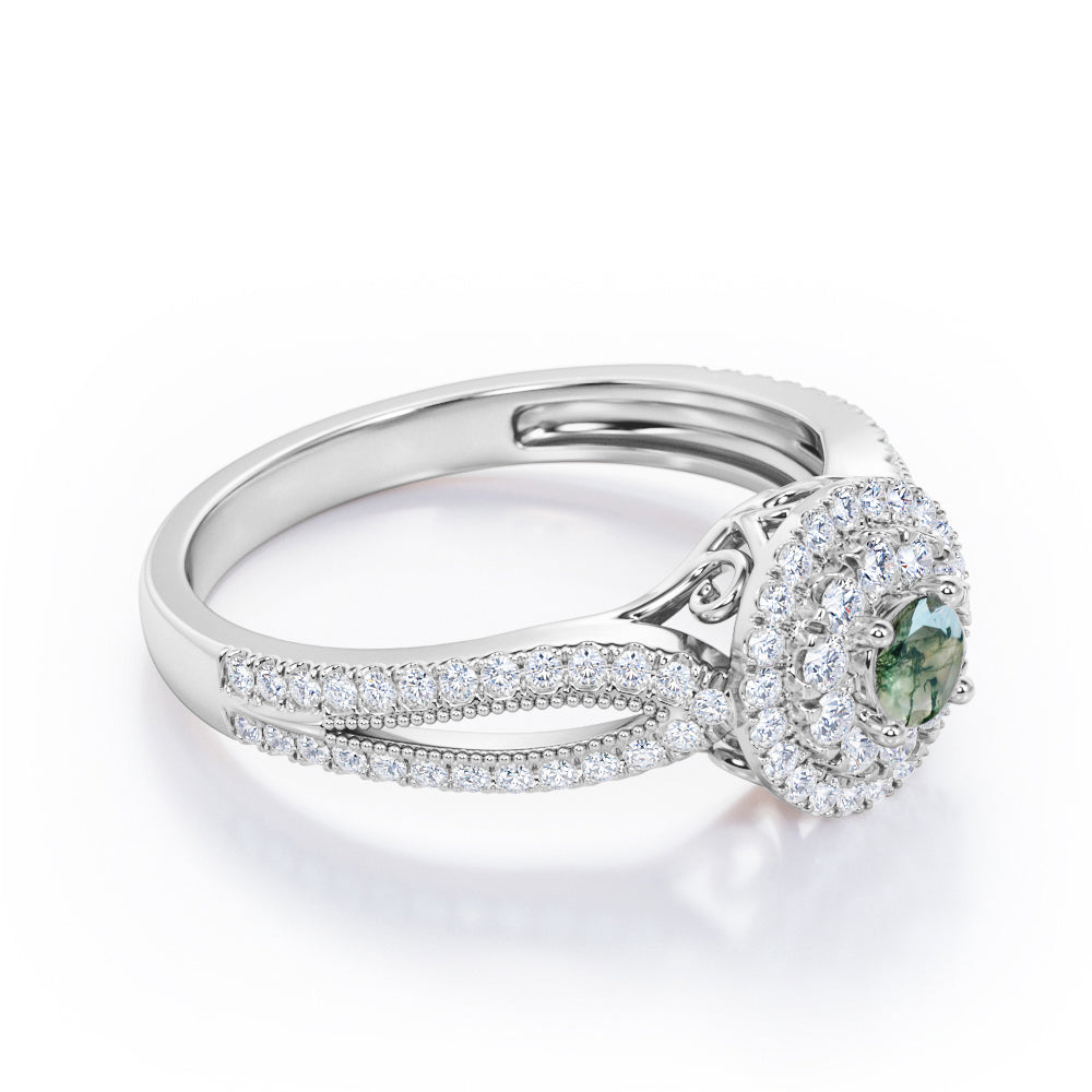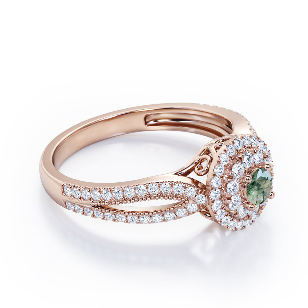 Double Halo Cluster 1.8 Carat Round-Shaped Green Moss Agate and diamond Split-Shaked Milgrain Pave Engagement Ring in Rose Gold