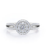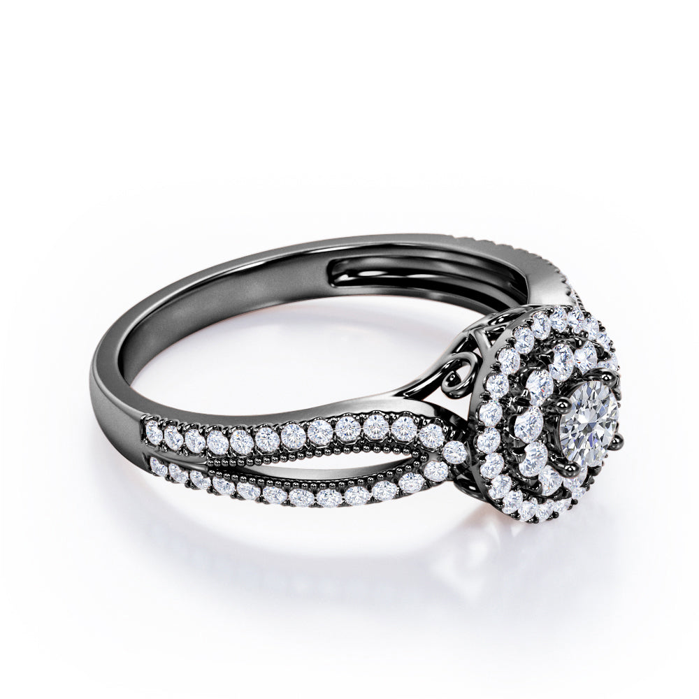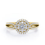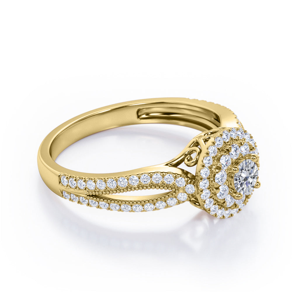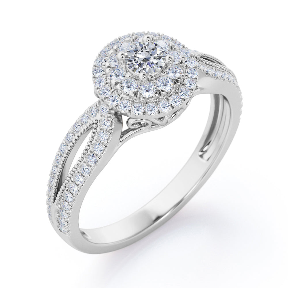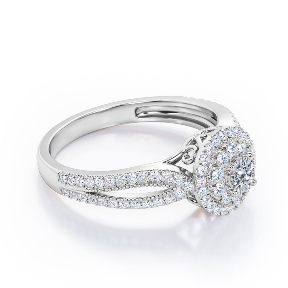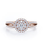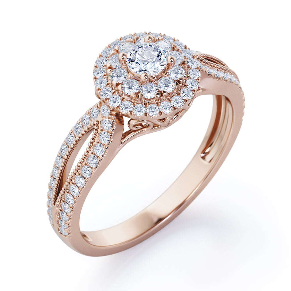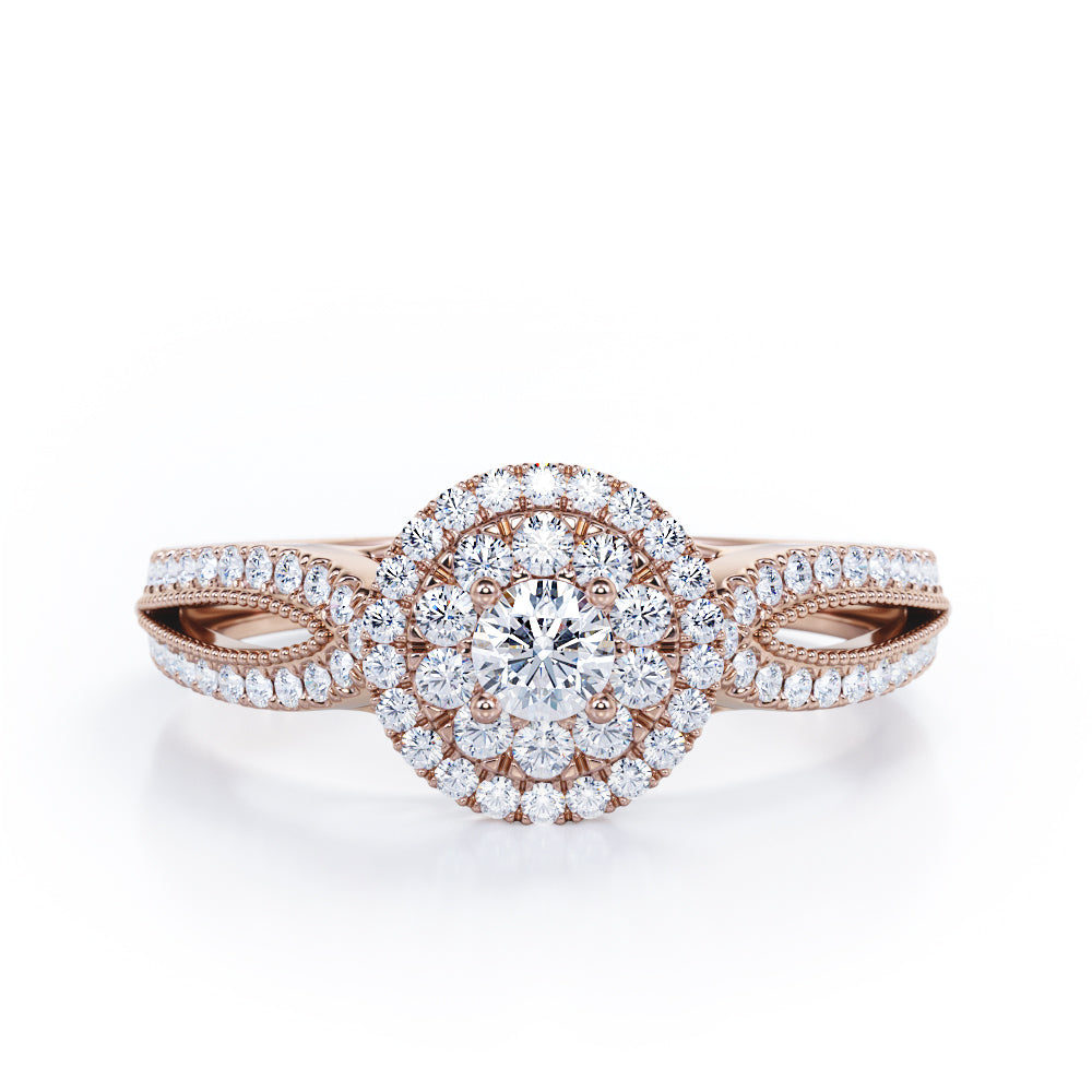 Double Halo Cluster 1.8 Carat Round-Shaped Moissanite and diamond Split-Shaked Milgrain Pave Engagement Ring in Rose Gold