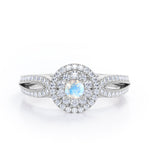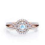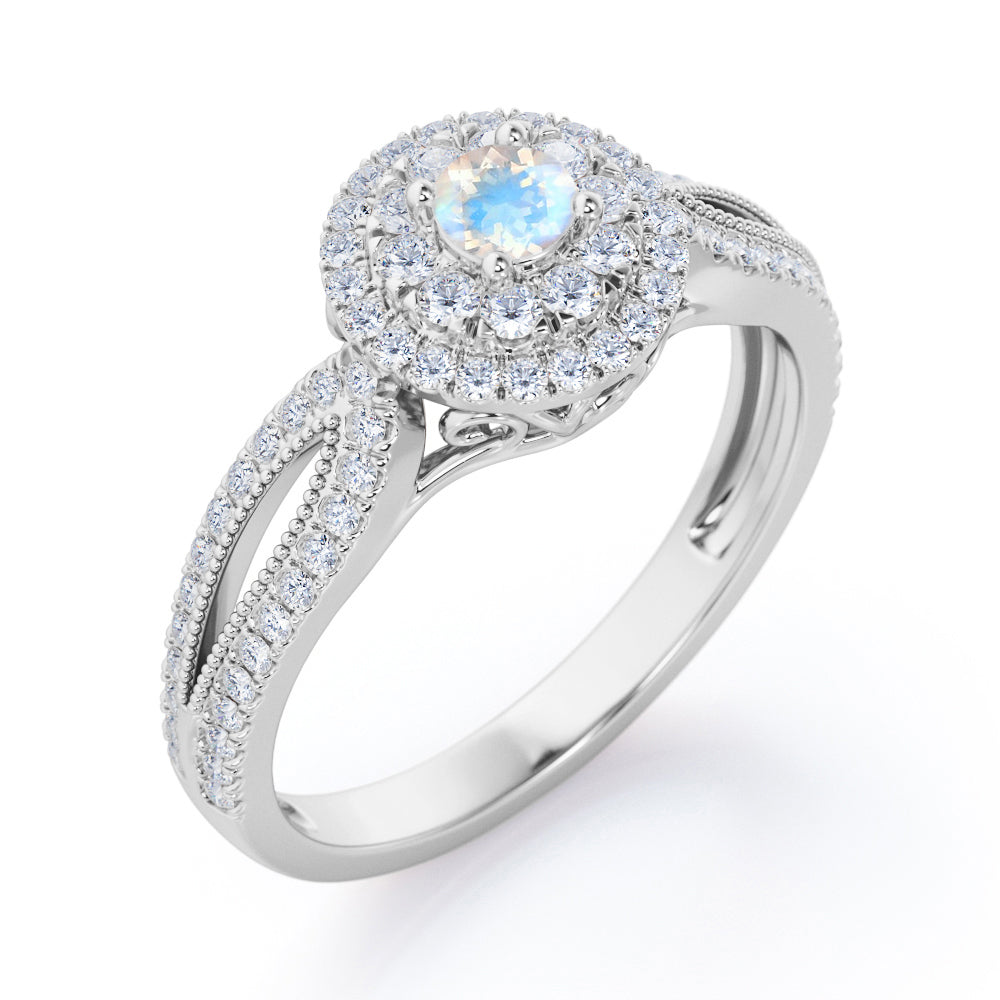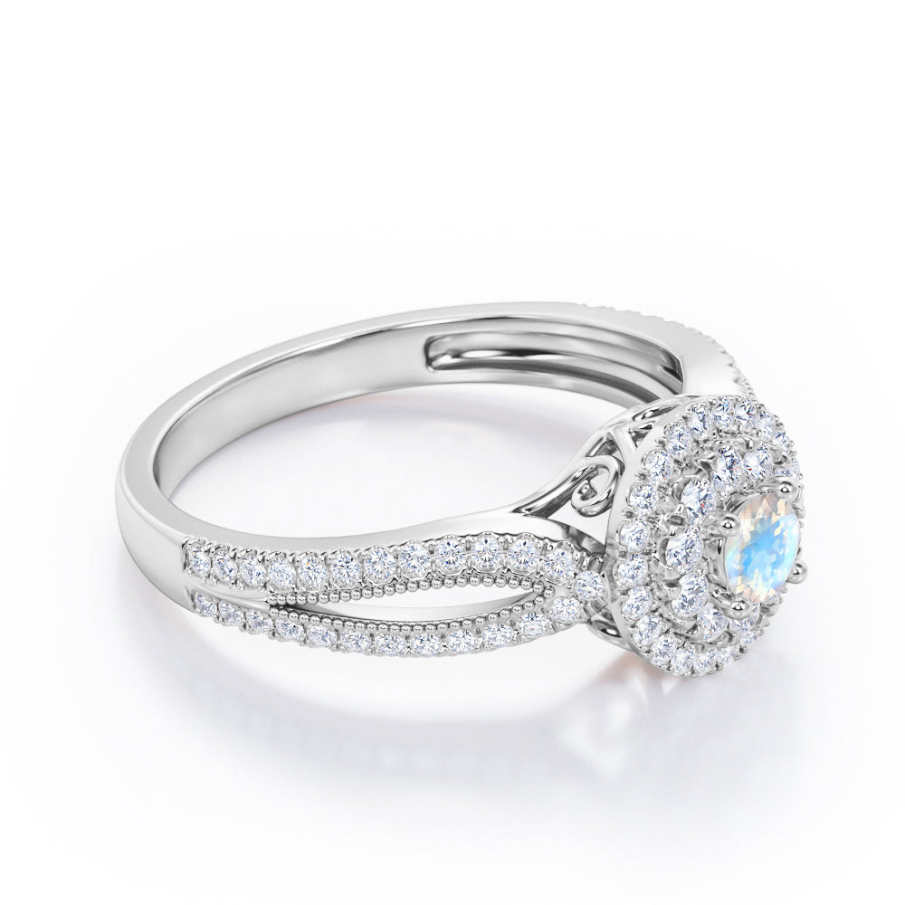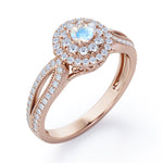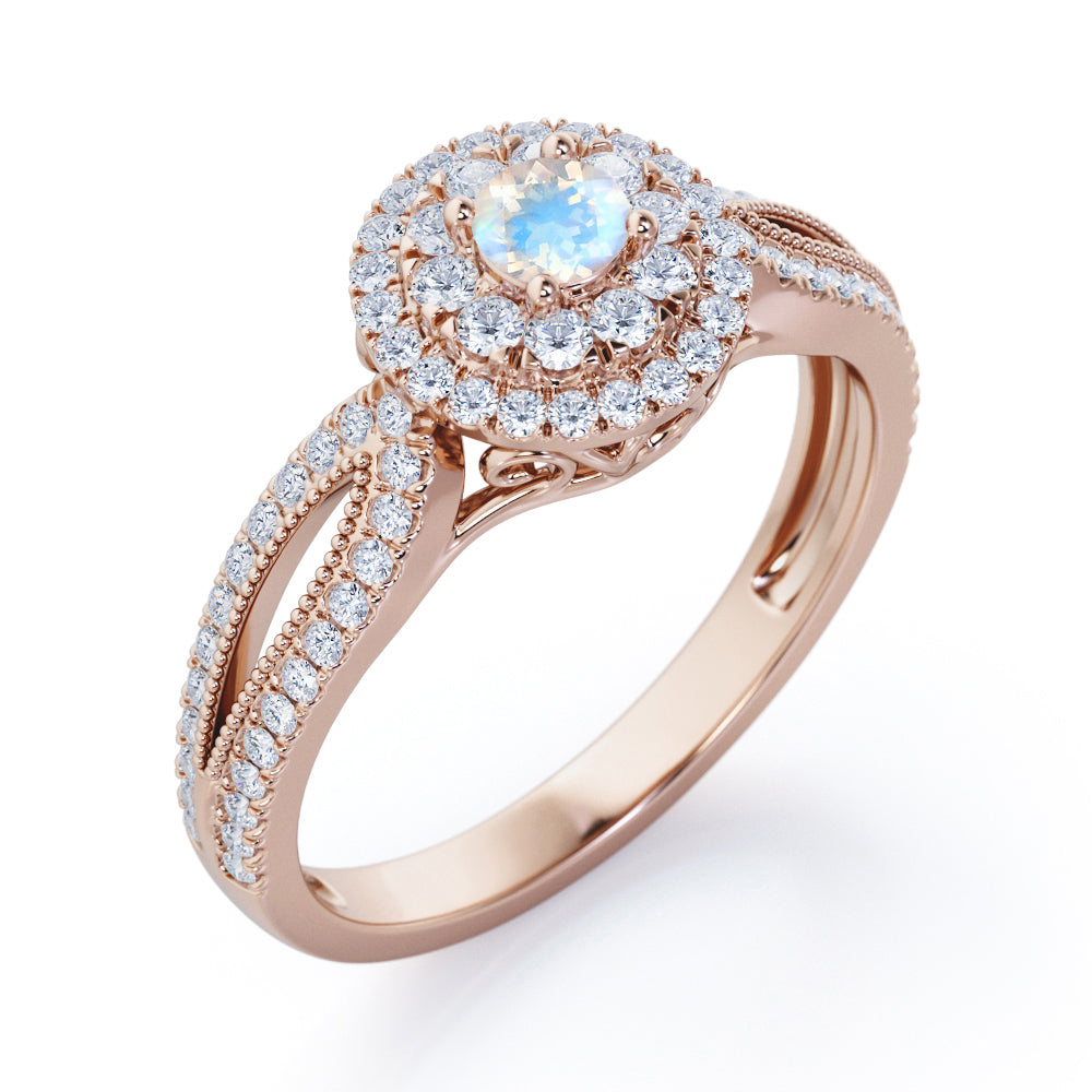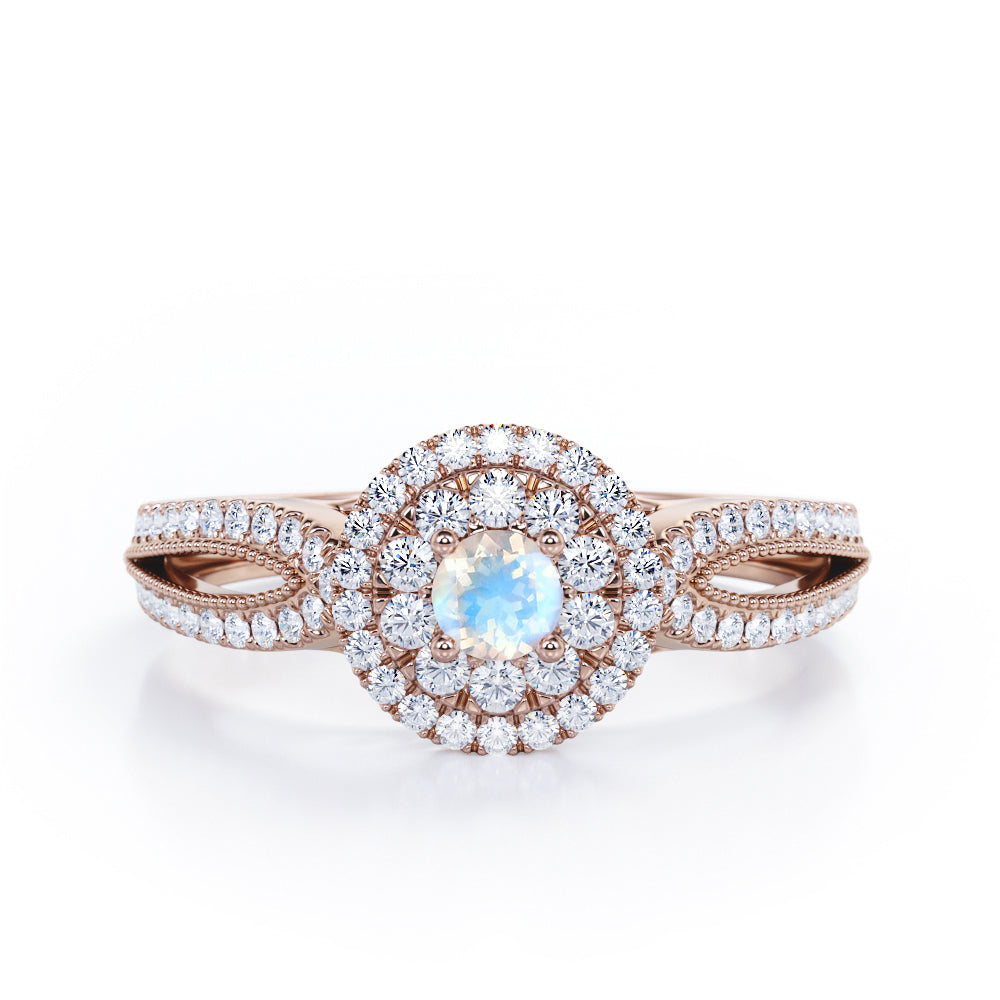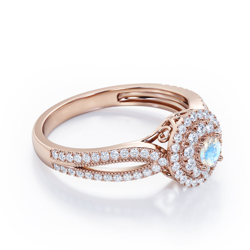 Double Halo Cluster 1.8 Carat Round-Shaped Moonstone and diamond Split-Shanked Milgrain Pave Engagement Ring in Rose Gold