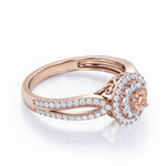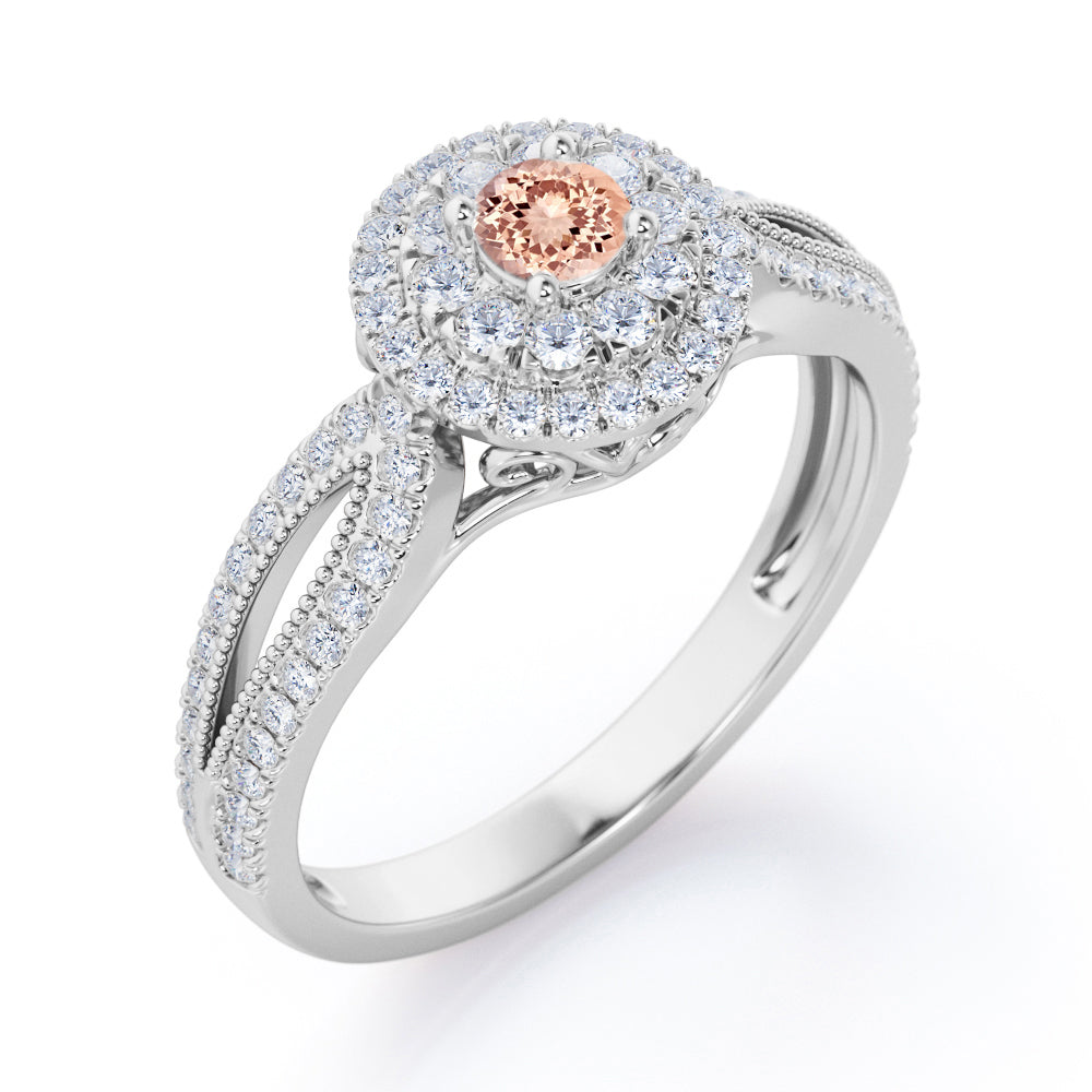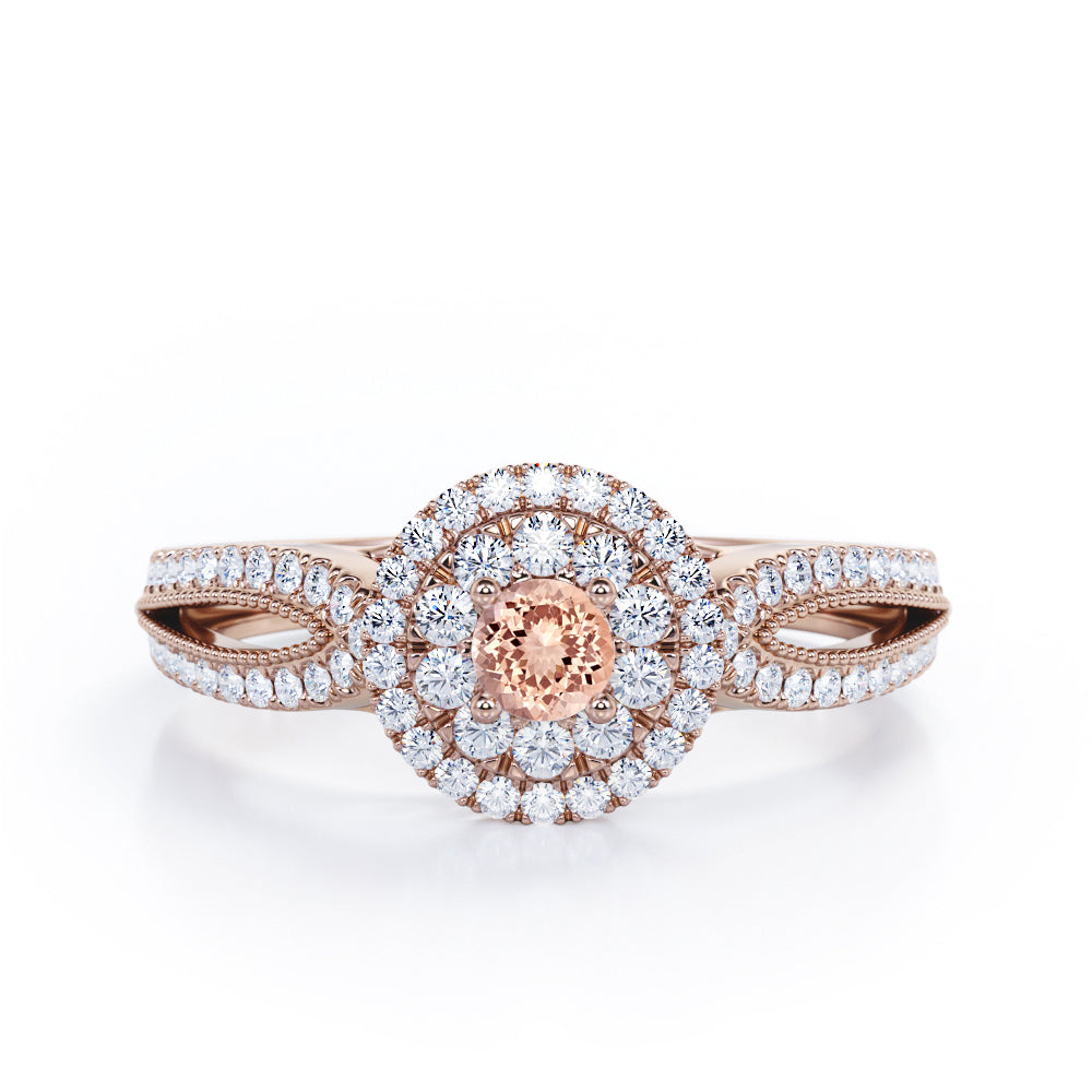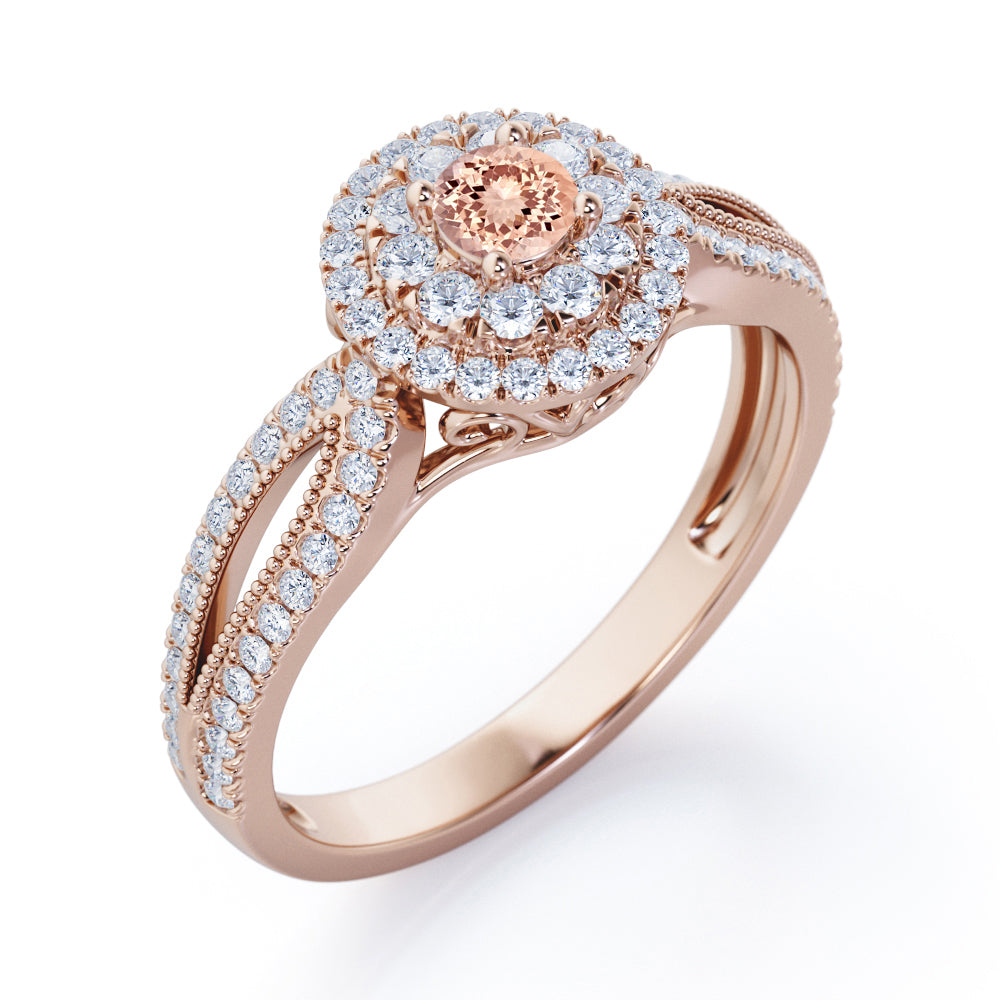 Double Halo Cluster 1.8 Carat Round-Shaped Morganite and diamond Split-Shaked Milgrain Pave Engagement Ring in Rose Gold