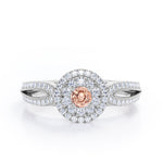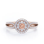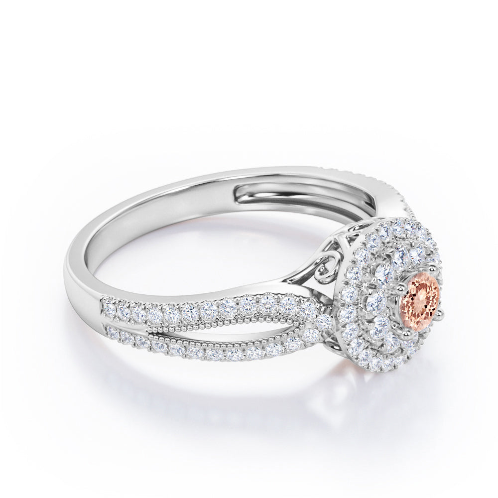 With this Double Halo Cluster 1.8 Carat Round-Shaped Morganite and diamond Split-Shaked Milgrain Pave Engagement Ring in Rose Gold, you can make your proposal day unforgettable. Handcrafted with care into a wonderful round cut by our lapidary expertise, this beautiful Morganite engagement ring is composed of a natural 1 carat round Morganite gemstone in the center with sparkling diamond side stones. Distinct and unusual, this gold Morganite ring for women is ideal for those who wish to express their charisma and uniqueness. This real Morganite ring for women is magnificent in its soft pink hue and will be an unmistakable addition to any jewelry collection. Beautiful and affordable, this cheap engagement ring is stunning and inexpensive, thanks to its reasonable price. Our cheap engagement ring, the birthstone ring for the month of November, represents riches and extravagance and would make an excellent gift for friends or your better half. This affordable engagement ring can be customized, either in rose gold, white gold, black gold, or yellow gold, upon customer request. Let's show her how much you care by giving her this real Morganite ring for women.