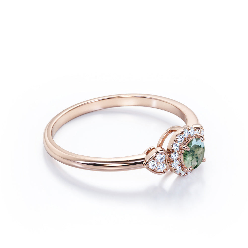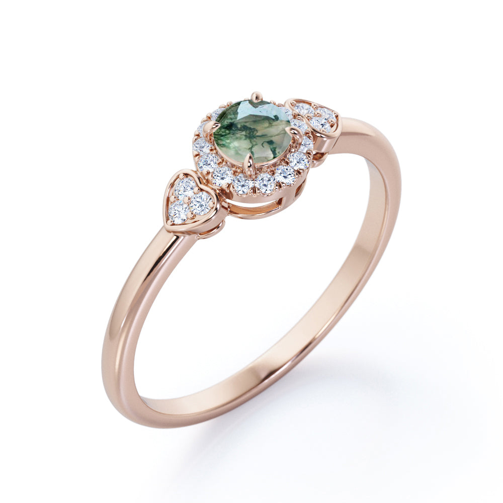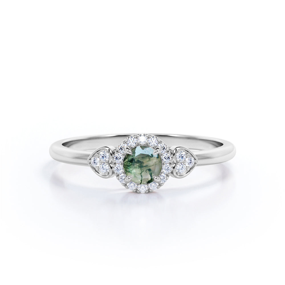 Double Hearts 0.7 carat Round Moss Agate and Moissanite Halo Engagement Ring in White Gold