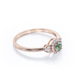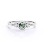 Propose to her with this lovely Double Hearts 0.7 carat Round Moss Agate and Moissanite Halo Engagement Ring in White Gold. Moss agate ring is now trending as an alternative engagement ring and you wouldn't want to miss it at a vert affordable price. The ring displays 0.5 carat round green Moss agate crystal as a center stone and framed by the round Moissanite halo. Both sides of the accent are flanked by 2 clustered hearts where each heart houses 3 round Moissanite within. 2 heart shapes represent two people that share the mutual eternity love. This Moss agate ring is adaptable and you don't have to only give this to your bride to be but it can be for anyone that you love and care for. Pick the color that will match them most; it can be either white gold, rose gold, yellow gold or black gold. The band of this promise ring can also be customized into 18k gold over silver, 10k gold and 14k gold