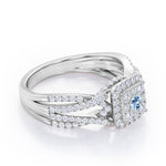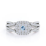 With this Double Infinity Split Shank - 1.4 Carat Round Shaped Aquamarine - Flush Cluster Halo Engagement Ring in White Gold, you can make your proposal day unforgettable. Hand-cut with deftness into a lovely shape round cut by our most talented jewelers, this wonderful cheap wedding ring is made up of natural 0.5 carat round Aquamarine gemstone in the center with 0.9 carat sparkling diamond side stones. Distinct and unusual, this real Aquamarine wedding ring is ideal for those who wish to express their charisma and uniqueness. Known for its healing properties, this gem engagement ring is magnificent with its glory and brilliance and will be an unmistakable addition to any jewelry collection. This affordable Aquamarine engagement ring is a great choice for any woman's jewelry collection. If you are looking for a Aquamarine ring for any special event, such as a birthday, an engagement, or a marriage proposal, this affordable engagement ring is a great option if you are in search for something truly special to give to your special someone. This gem engagement ring can be customized, so customers can choose one of metal colors between rose gold, white gold, black gold, and yellow gold. Let's show her how much you care by giving her this Aquamarine band.