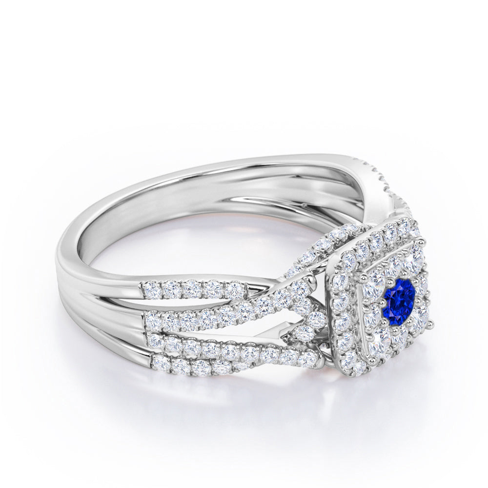 Double Infinity Split Shank - 1.4 Carat Round Shaped Blue Sapphire and diamond - Flush Cluster Halo Engagement Ring in White Gold