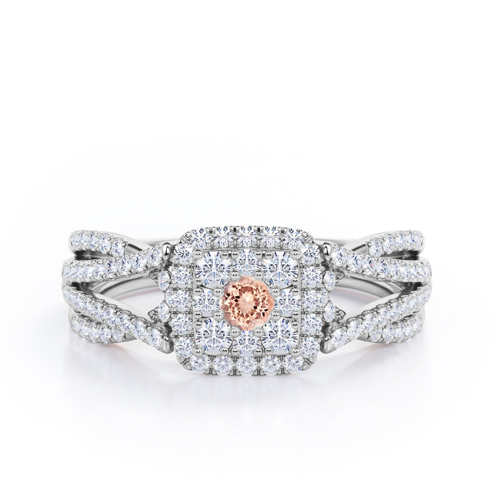 Double Infinity Split Shank - 1.4 Carat Round Shaped Morganite and diamond - Flush Cluster Halo Engagement Ring in White Gold