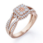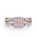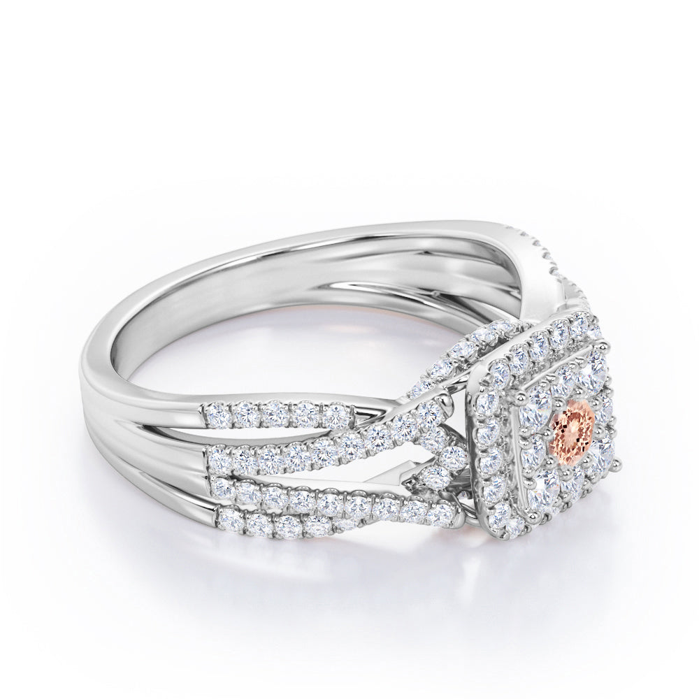 With this Double Infinity Split Shank - 1.4 Carat Round Shaped Morganite and diamond - Flush Cluster Halo Engagement Ring in White Gold, you can make your proposal day unforgettable. Hand-cut with deftness into a lovely shape round cut by our most talented jewelers, this wonderful cheap wedding ring is made up of natural 0.5 carat round Morganite in the center with 0.9 carat sparkling diamond side stones. Distinct and unusual, this real Morganite wedding ring is ideal for those who wish to express their charisma and uniqueness. Known for its healing properties, this gem engagement ring is magnificent in its soft pink hue and luminous color and will be an unmistakable addition to any jewelry collection. This affordable Morganite engagement ring is a great choice for any woman's jewelry collection. If you are looking for a Morganite ring for any special event, such as a birthday, an engagement, or a marriage proposal, this affordable engagement ring is a great option if you are in search for something truly special to give to your special someone. This gem engagement ring can be customized, so customers can choose one of metal colors between rose gold, white gold, black gold, and yellow gold. Let's show her how much you care by giving her this Morganite band.