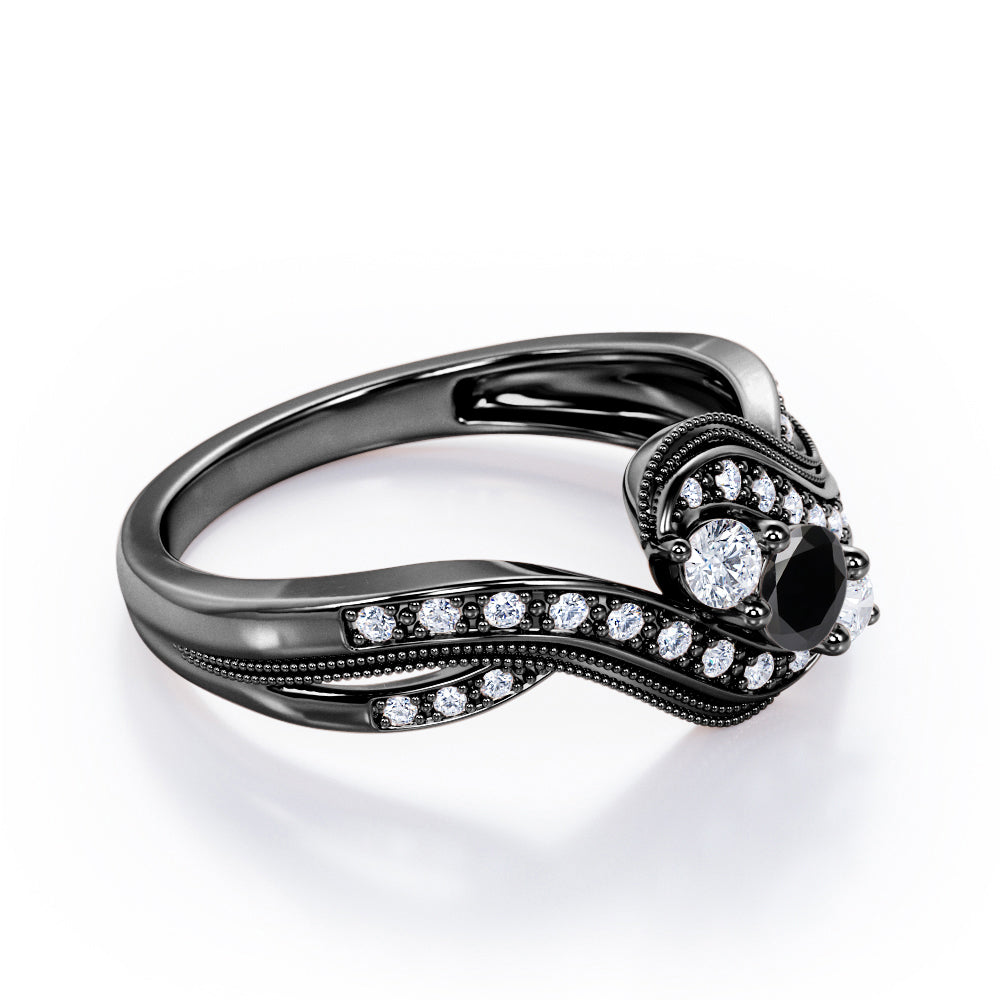 Let your lover carry a beautiful reminder of your eternal love with them everywhere. A Double Milgrain Curve Infinity 0.7 carat Round Black diamonds Engagement Ring in Black Gold showcases a 0.33 carat round Black diamond between two smaller round Moissanite; the three stones are wrapped by contoured band that looks like an infinity sign, symbolizing a forever love and time that you would like to share with your special someone. The band is decorated with dainty round Moissanite in bead setting along with a double Milgrain line which synch and compliment each other very well. The curvy lines on the ring also looks like gentle waves that it helps making you feel more calm and at ease. The ring can be made in 18k gold over silver, 10k gold and 14k gold with the color of white gold, rose gold, yellow gold and black gold.