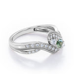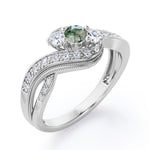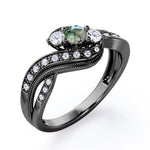 Let your lover carry a beautiful reminder of your eternal love with them everywhere. A Double Milgrain Curve Infinity 0.7 carat Round Moissanite and Diamonds Engagement Ring in Black Gold showcases a 0.33 carat round Green Moss Agate between two smaller round Moissanite; the three stones are wrapped by contoured band that looks like an infinity sign, symbolizing a forever love and time that you would like to share with your special someone. The band is decorated with dainty round Moissanite in bead setting along with a double Milgrain line which synch and compliment each other very well. The curvy lines on the ring also looks like gentle waves that it helps making you feel more calm and at ease. The ring can be made in 18k gold over silver, 10k gold and 14k gold with the color of white gold, rose gold, yellow gold and black gold.
