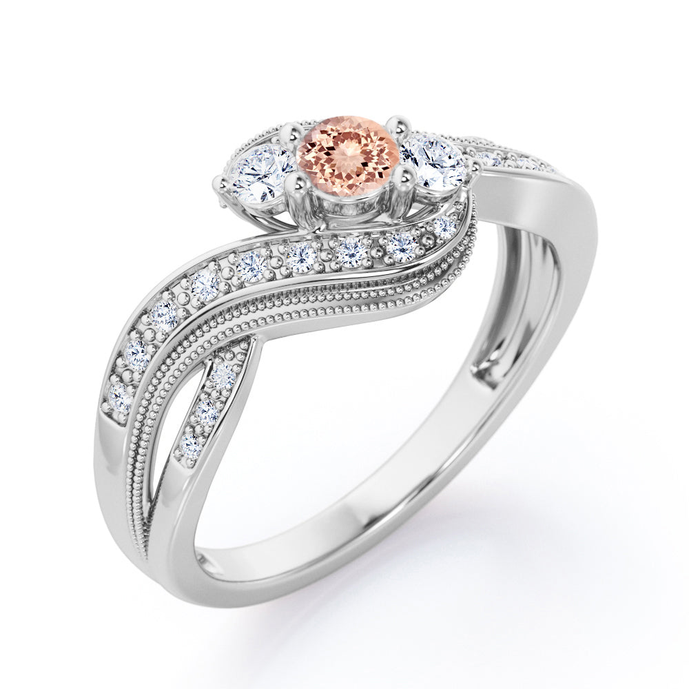 Let your lover carry a beautiful reminder of your eternal love with them everywhere. A Double Milgrain Curve Infinity 0.7 carat Round Moissanite and Diamonds Engagement Ring in Rose Gold showcases a 0.33 carat round Morganite between two smaller round Moissanite; the three stones are wrapped by contoured band that looks like an infinity sign, symbolizing a forever love and time that you would like to share with your special someone. The band is decorated with dainty round Moissanite in bead setting along with a double Milgrain line which synch and compliment each other very well. The curvy lines on the ring also looks like gentle waves that it helps making you feel more calm and at ease. The ring can be made in 18k gold over silver, 10k gold and 14k gold with the color of white gold, rose gold, yellow gold and black gold.