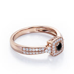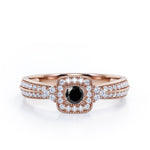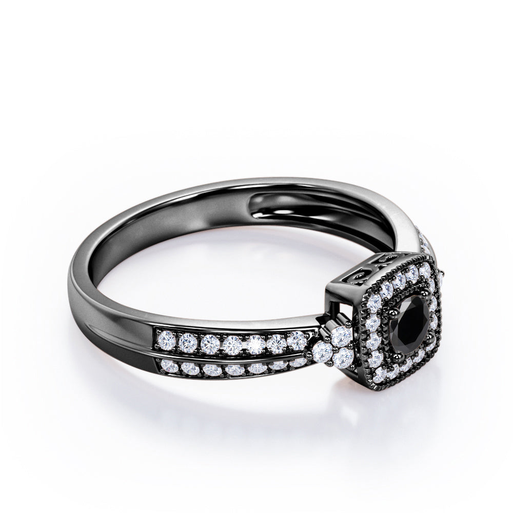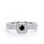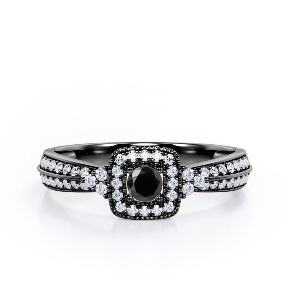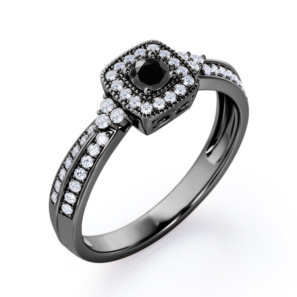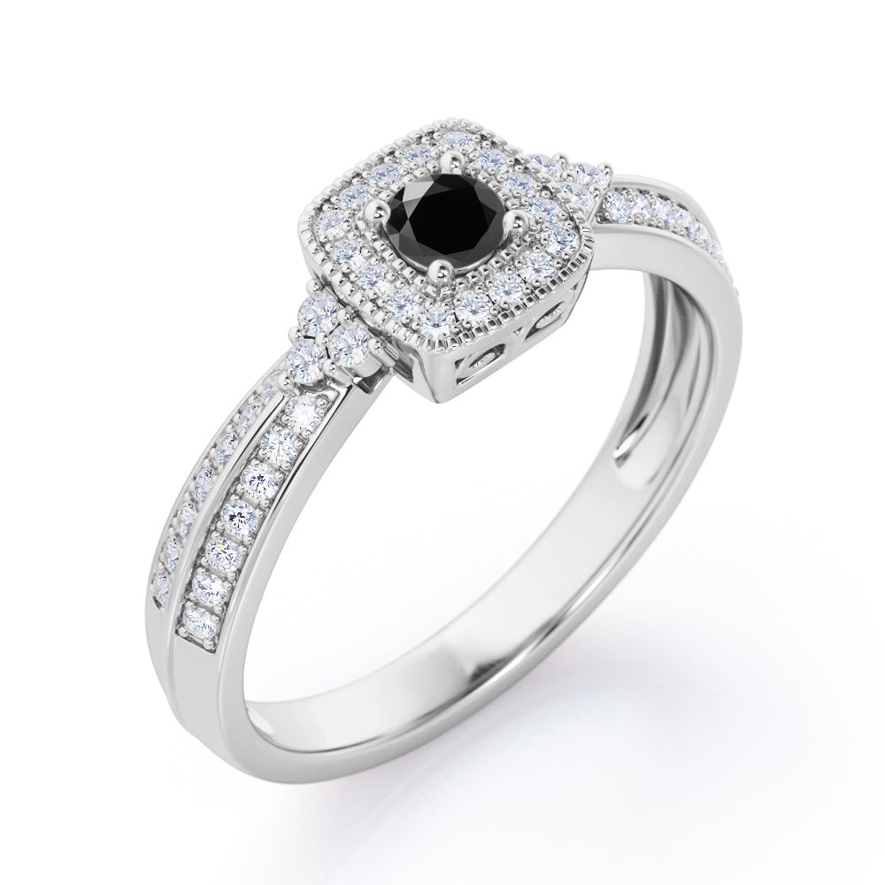 With this Double Pave Channel 1.5 Carat Round-Shaped Black Diamond Halo Cluster Engagement Ring in White Gold, your better half will easily stand out from the crowd. Hand-cut with deftness into a lovely shape round cut by our most talented jewelers, this gorgeous Black Diamond promise ring for her consists of a natural 1 carat round shaped Black Diamond stone in the center and is enhanced with 0.5 carat of sparkling diamonds on the side for a total carat weight of 1.5 carat. For those looking for something a little out of the ordinary, this real Black Diamond wedding ring is an excellent choice. This gem engagement ring is magnificent with its glory and brilliance and will be an unmistakable addition to any jewelry collection. Beautiful and affordable, this cheap wedding ring is stunning and inexpensive, thanks to its reasonable price. This wedding anniversary ring a great choice. Also, this cheap real Black Diamond ring can be customized, either in white gold, rose gold, yellow gold, black gold, upon customer request. Let's show her how much you care by giving her this gold band with Black Diamonds, and she will never regret it.