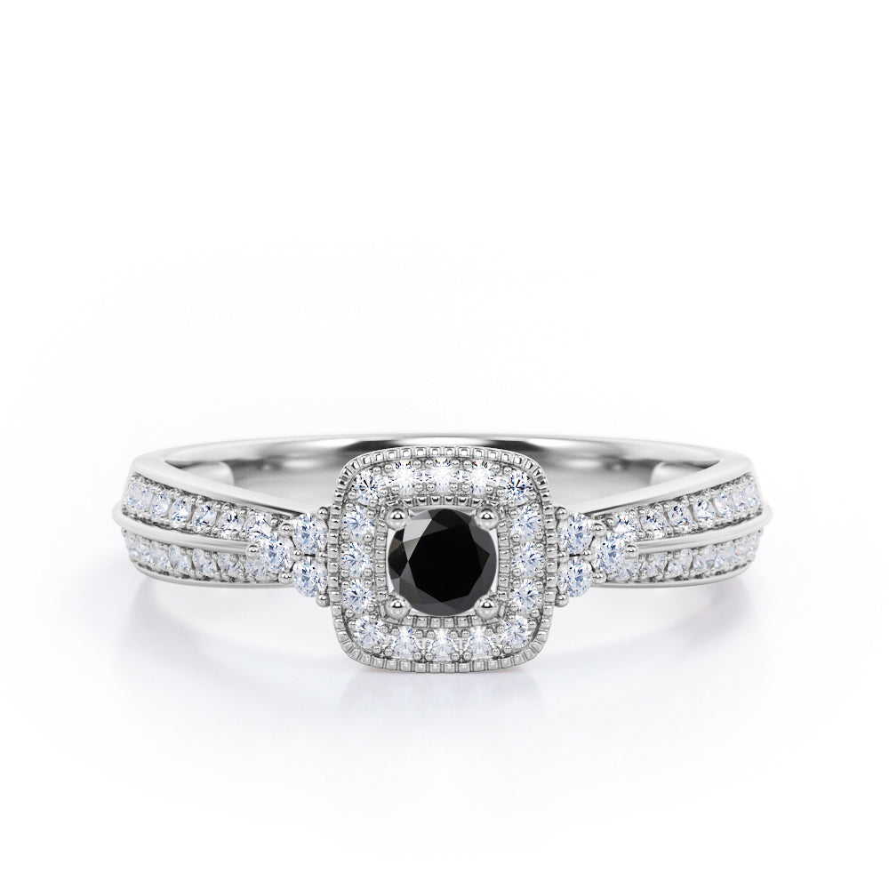 Double Pave Channel 1.5 Carat Round-Shaped Black Diamond Halo Cluster Engagement Ring in White Gold