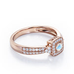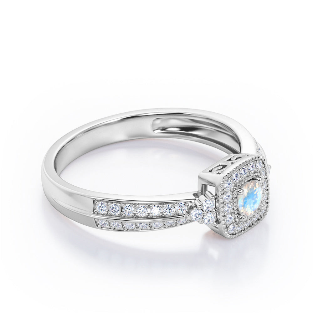 With this Double Pave Channel 1.5 Carat Round-Shaped Moonstone and diamond Halo Cluster Engagement Ring in Rose Gold, your better half will easily stand out from the crowd. Hand-cut with deftness into a lovely shape round cut by our most talented jewelers, this gorgeous Moonstone promise ring for her consists of a natural 1 carat round shaped Moonstone stone in the center and is enhanced with 0.5 carat of sparkling diamonds on the side for a total carat weight of 1.5 carat. For those looking for something a little out of the ordinary, this real Moonstone wedding ring is an excellent choice. This gem engagement ring is magnificent with iridescence shine and will be an unmistakable addition to any jewelry collection. Beautiful and affordable, this cheap wedding ring is stunning and inexpensive, thanks to its reasonable price. This wedding anniversary ring a great choice. Also, this cheap real Moonstone ring can be customized, either in white gold, rose gold, yellow gold, black gold, upon customer request. Let's show her how much you care by giving her this gold band with Moonstones, and she will never regret it.