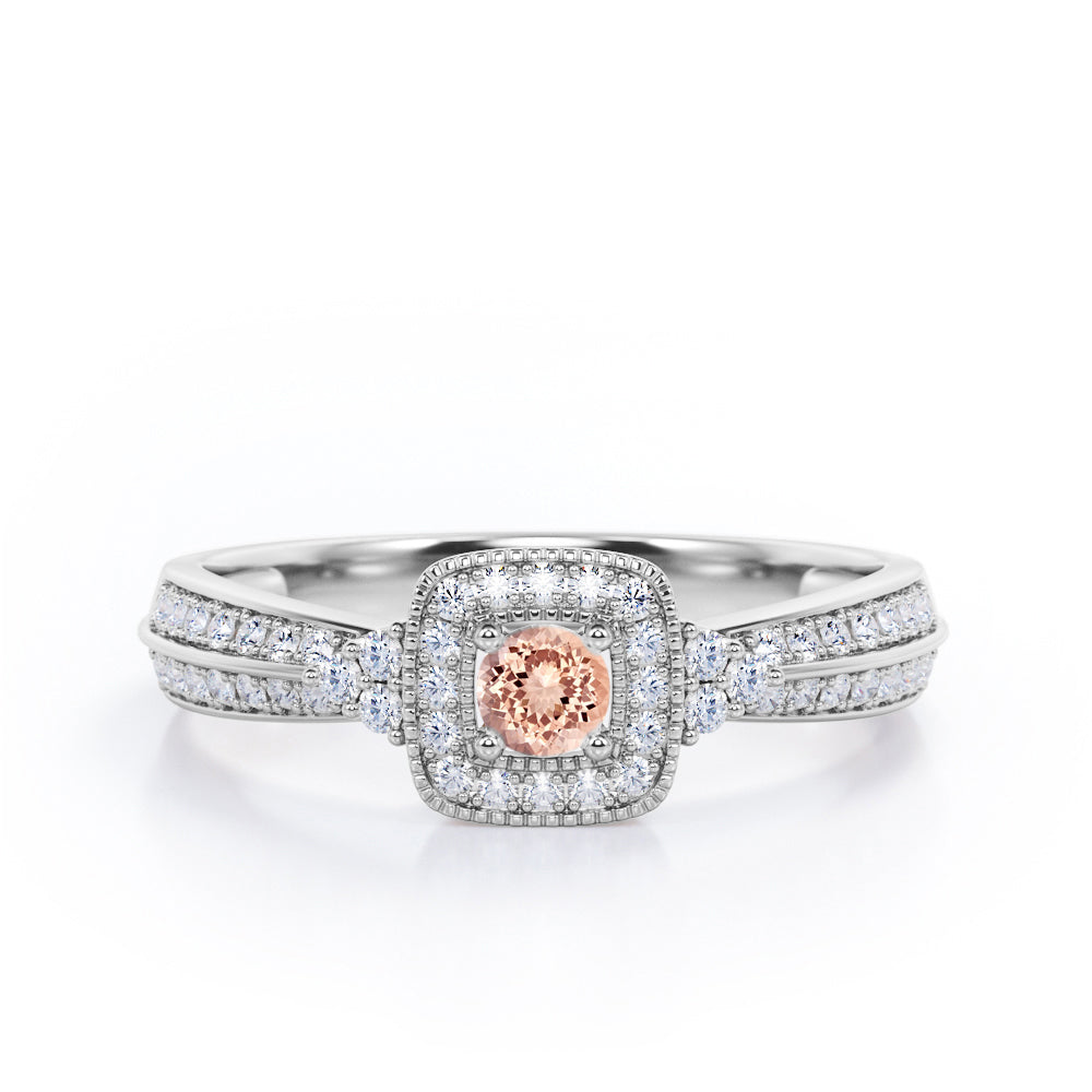 Double Pave Channel 1.5 Carat Round-Shaped Morganite and diamond Halo Cluster Engagement Ring in White Gold