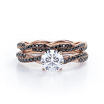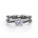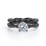 Create a magical moment with this Double Twisted Eternity - 1.75 TCW Round Cut Moissanite with Lab Created Black Diamond - Basket Cathedral Bridal Ring Set in White gold. Skillfully hand-cut into a nice round cut by our experts in lapidary, this splendid moissanite wedding bands set is composed of total 1.75 carat moissanite and lab-created black diamonds. Special and non-traditional, this moissanite band rings set is perfect for those who would love to express their charisma and uniqueness. With naked eyes moissanites look, shine and feel exactly like diamonds. With its glory and clarity, this moissanite jewelry will absolutely enhance every style of its wearer. This moissanite band set is beautiful and accessible since it is available at a reasonable price. Moissanites are the most popular alternative gemstone for diamonds while being at lower and more affordable price. If you are looking for a special gift for your friends or your better half, this moissanite band set, the birthstone ring for April, symbolically representing strength and an unbreakable love, will be the greatest choice you will ever make. This moissanite silver engagement rings set can be customized, so customers can choose one of metal colors between White gold, rose gold, yellow gold and black gold in 18k Gold over Silver, 10k and 14k gold metal options. In regards to its hardness, moissanite is almost as hard as diamond which means that it is notably durable. Let’s impress her with this moissanite wedding band set and, surely, she will not regret it.