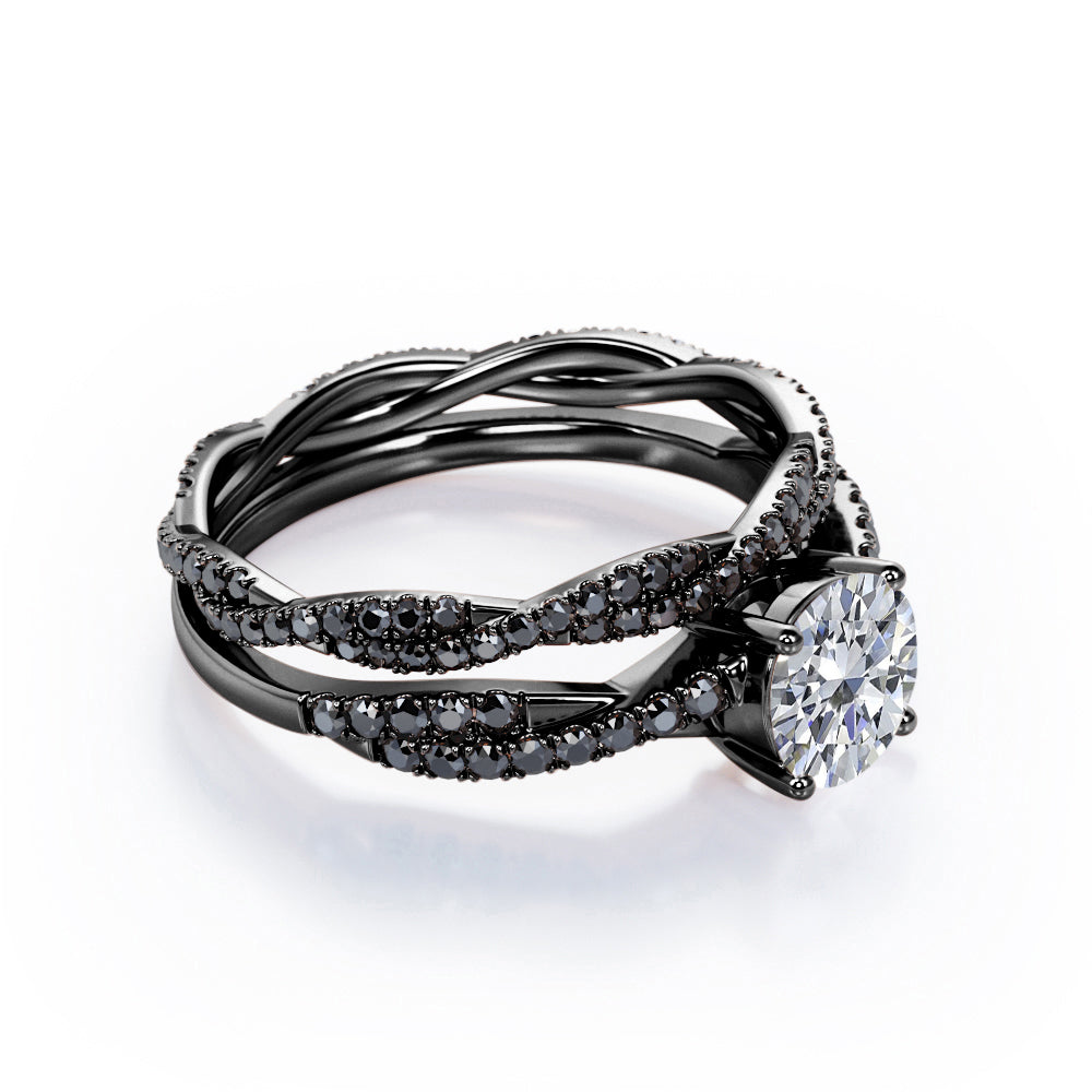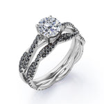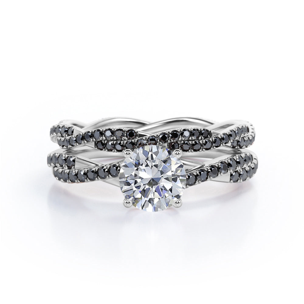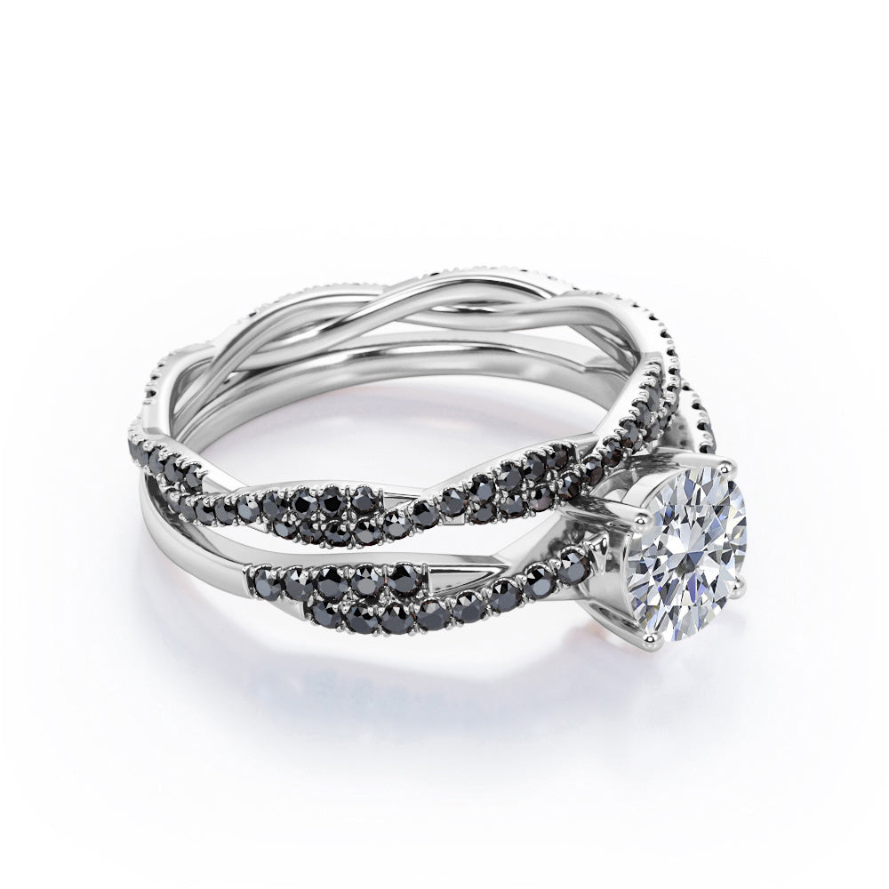 Double Twisted Eternity - 1.75 TCW Round Cut Moissanite with Lab Created Black Diamond - Basket Cathedral Bridal Ring Set in White Gold