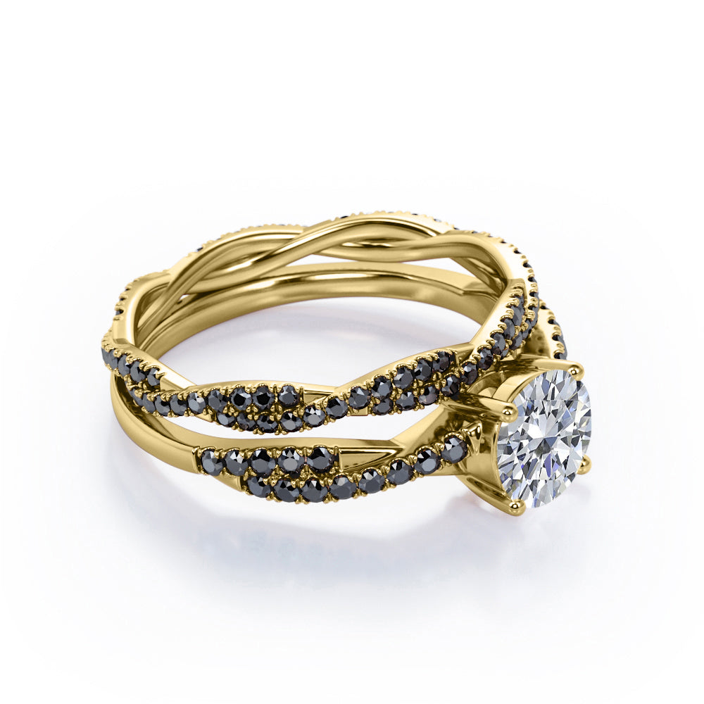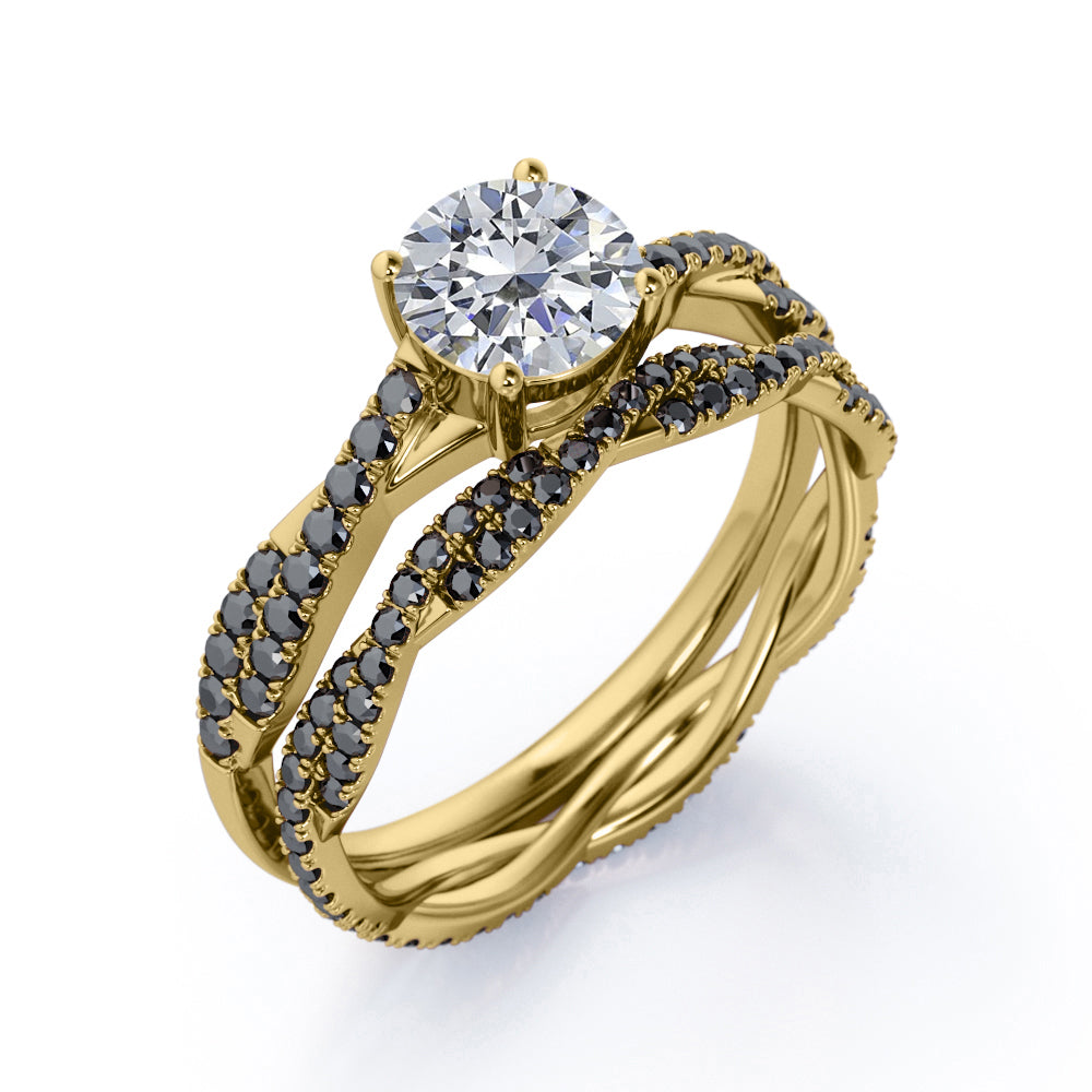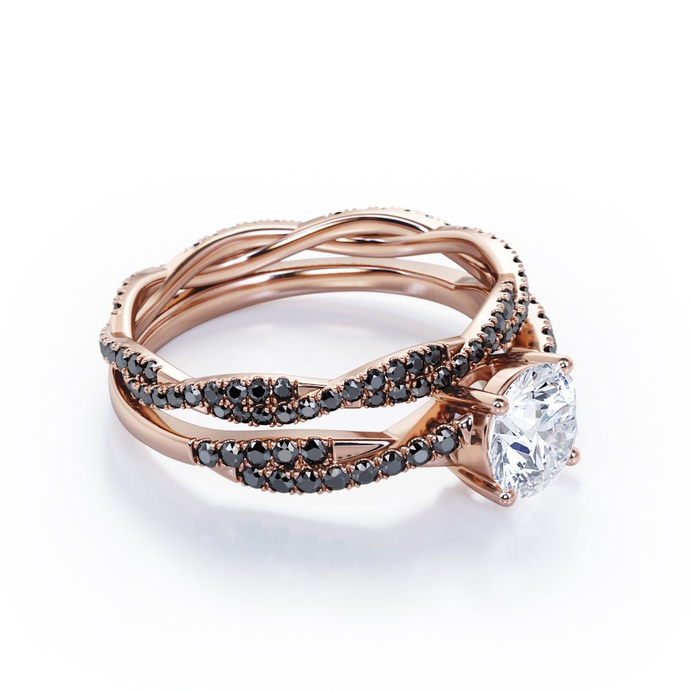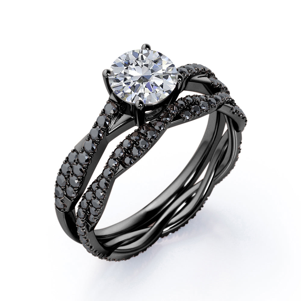 Double Twisted Eternity - 1.75 TCW Round Cut Moissanite with Lab Created Black Diamond - Basket Cathedral Bridal Ring Set in White Gold