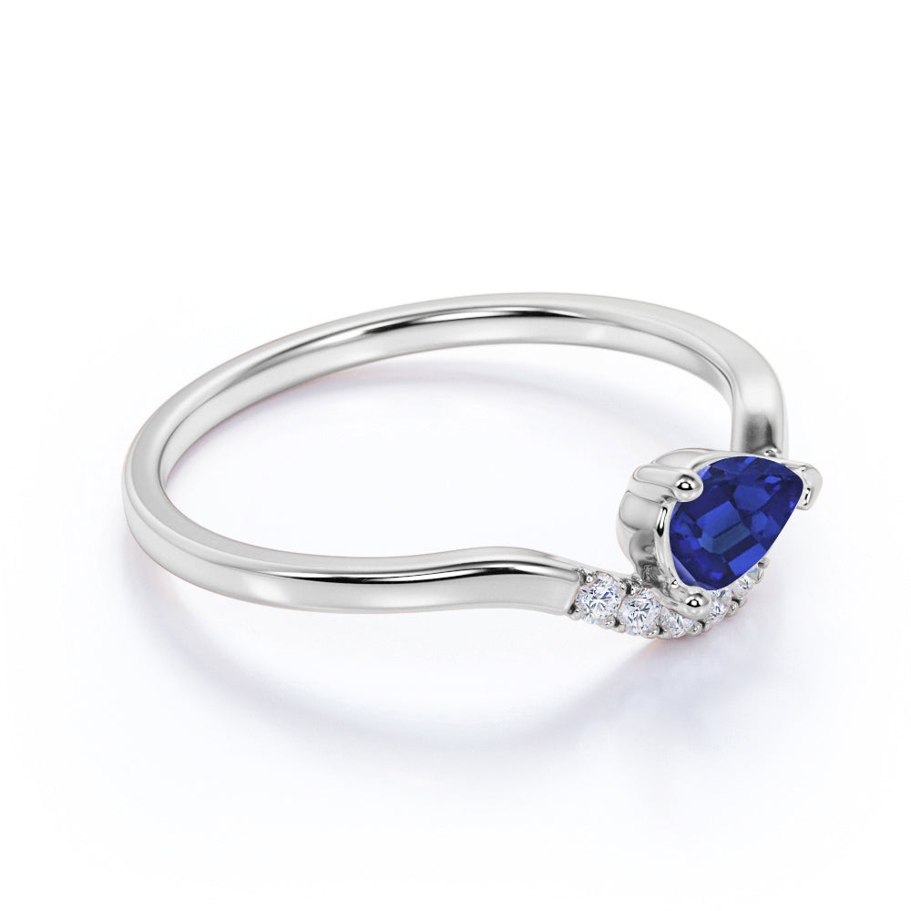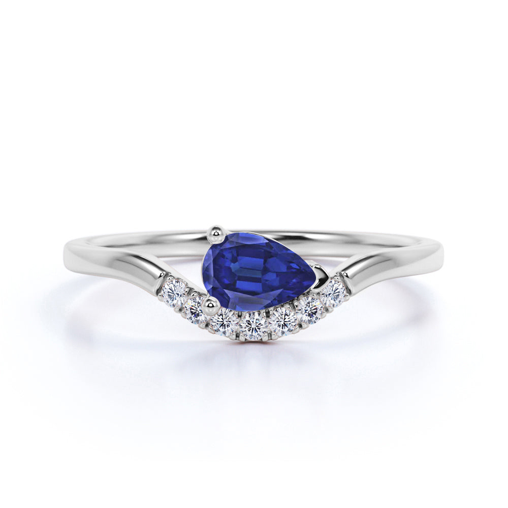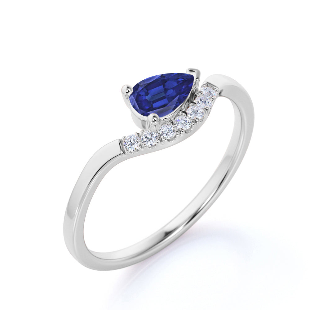 East West 1 Carat Teardrop Corn Blue Sapphire and Diamond Curved Engagement Ring in White Gold