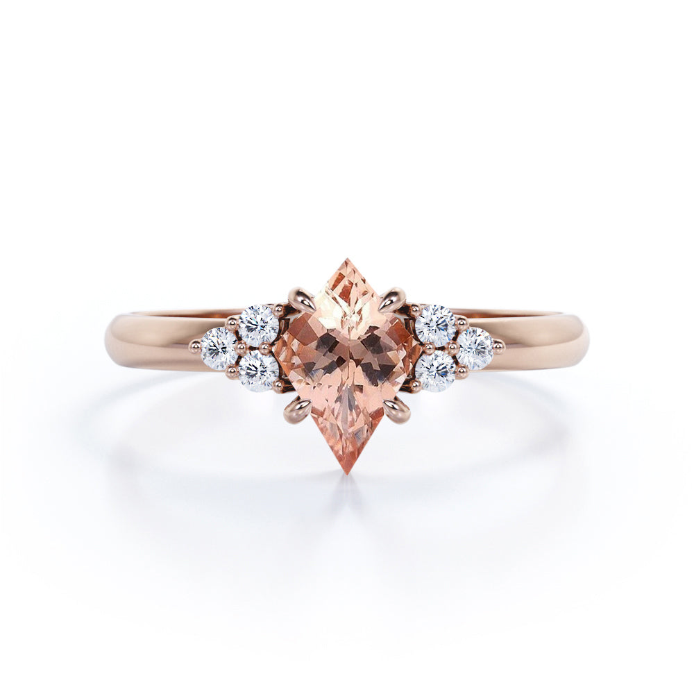 A 0.5 carat kite Morganite is placed between six round Moissanite on an Edgy 0.55 carat Kite Morganite and Moissanite Engagement Ring in Rose Gold. Three round petite Moissanite stones are flanked by the side Morganite and formed into triangle. Combine the clustered triangles with kite shape center stone, it makes the ring looks like a sparkling northern star. It can be a meaningful gift to your mom or lover that they are the light in your life that guide you to a better and happier path. This promise ring can be made in 18k gold over silver, 10k gold and 14k gold with the color of white gold, rose gold and black gold.