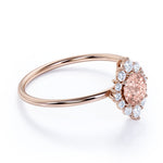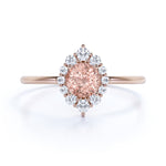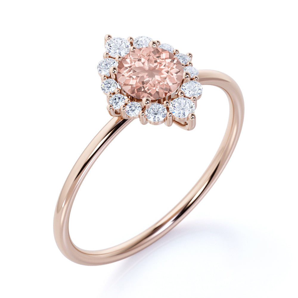 Elegant 0.75 Carat Round Pink Brown Morganite and Diamond Halo Dainty Engagement Ring in Rose Gold