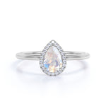 The colorful play of light from this faceted rainbow moonstone and pave diamond halo engagement ring will surely put a sparkle in your eyes. This moonstone engagement ring features an approximately 1 carat pear shape natural rainbow moonstone in the center of the engagement ring, surrounded by .50 carat real diamonds for gold ring and moissanite for silver ring, for a total weight of 1.50 carats.