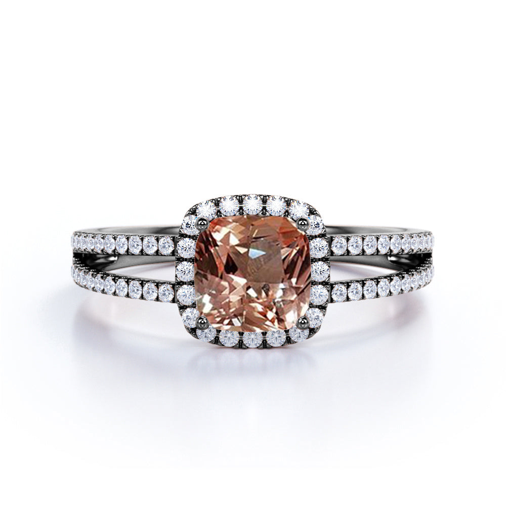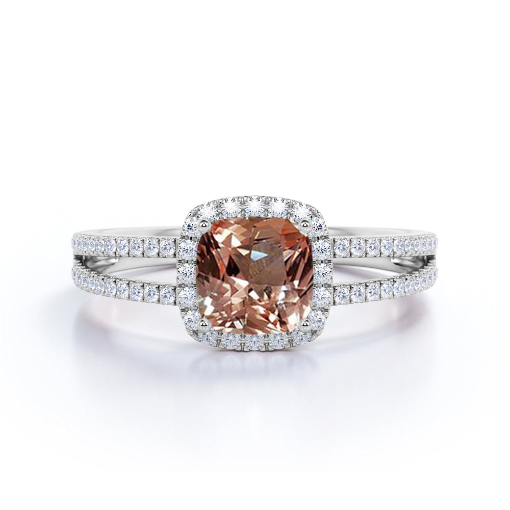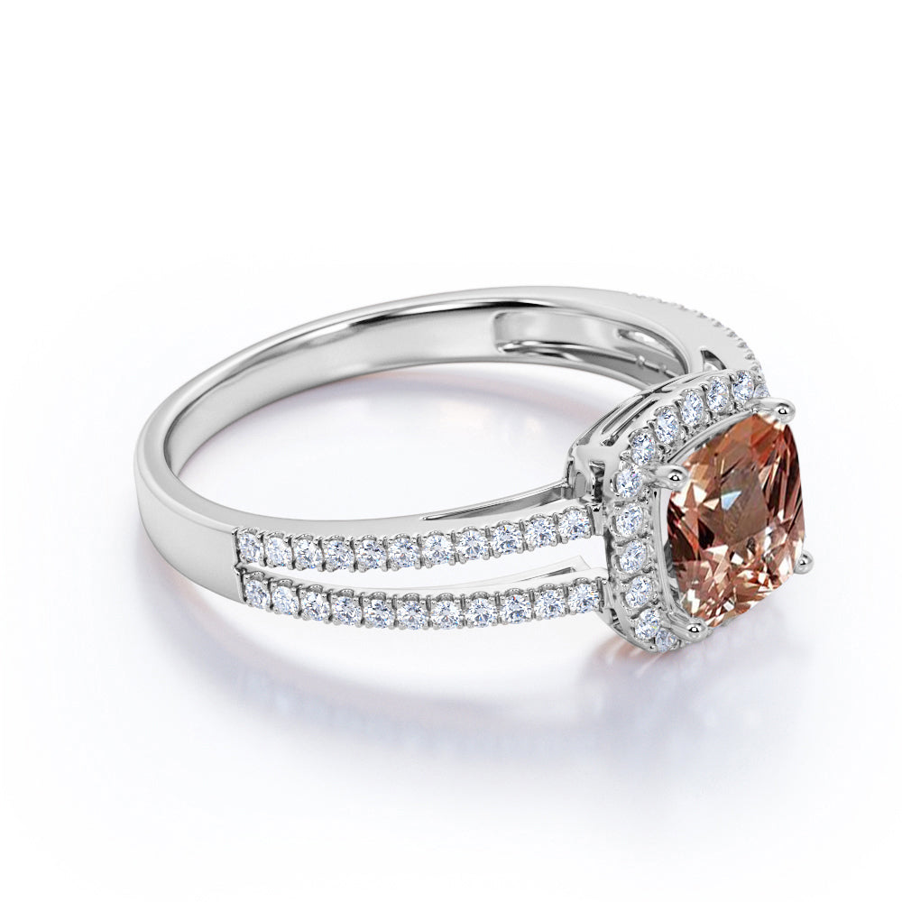 Uniqueness makes you stand out and this unique morganite ring is perfect for you. This morganite ring represents your love, affection and towards an infinite life together. This morganite ring features an approximately 1 carat cushion shape natural morganite, surrounded by .50 carat authentic diamond accent, for a total weight of 1 carats.