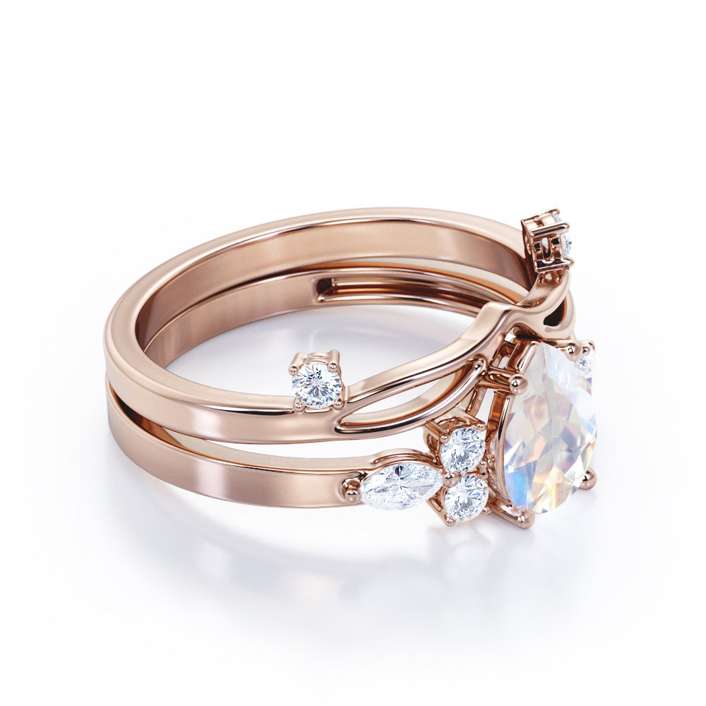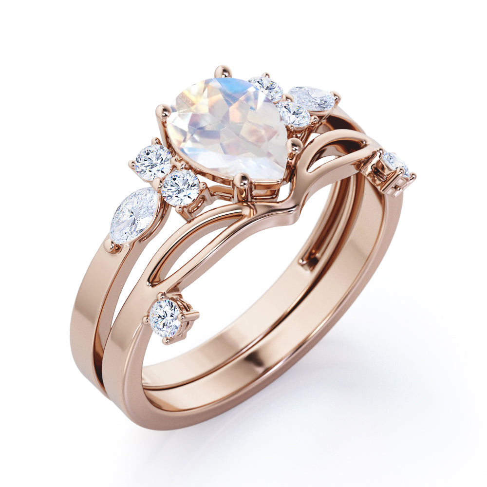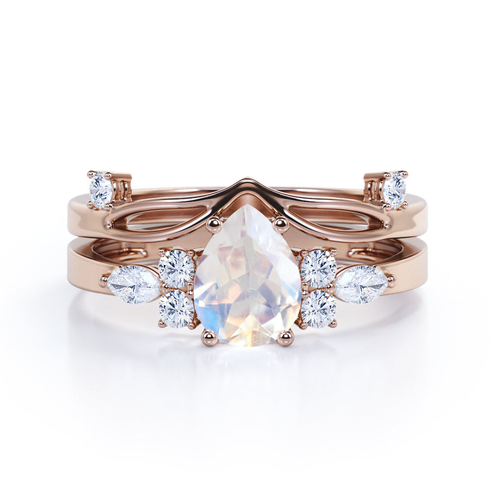 Elegant Art Décor 0.6 carat Pear Moonstone and Moissanite Wedding Ring Set in Rose Gold