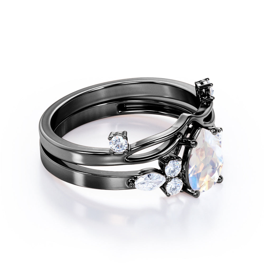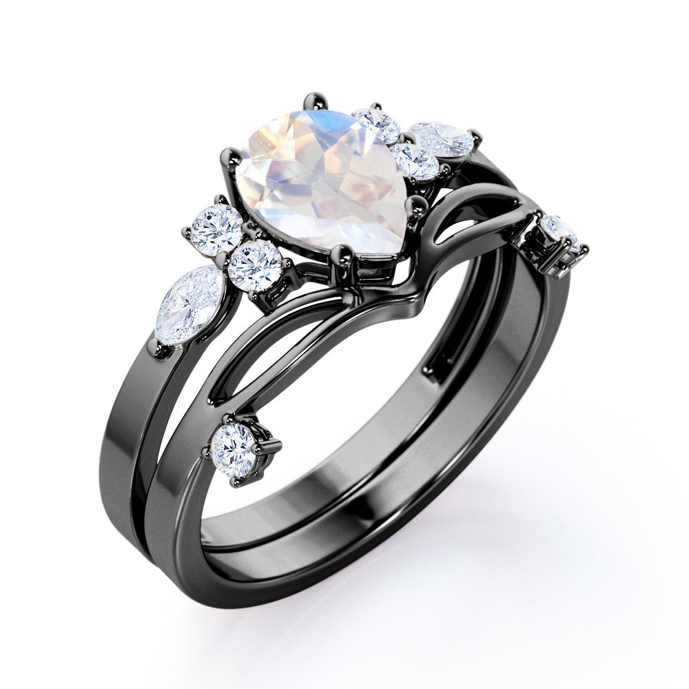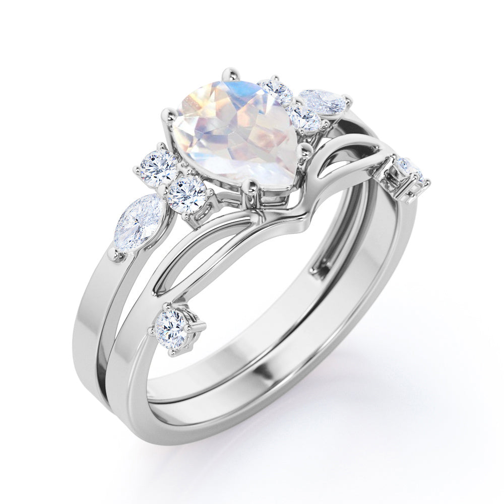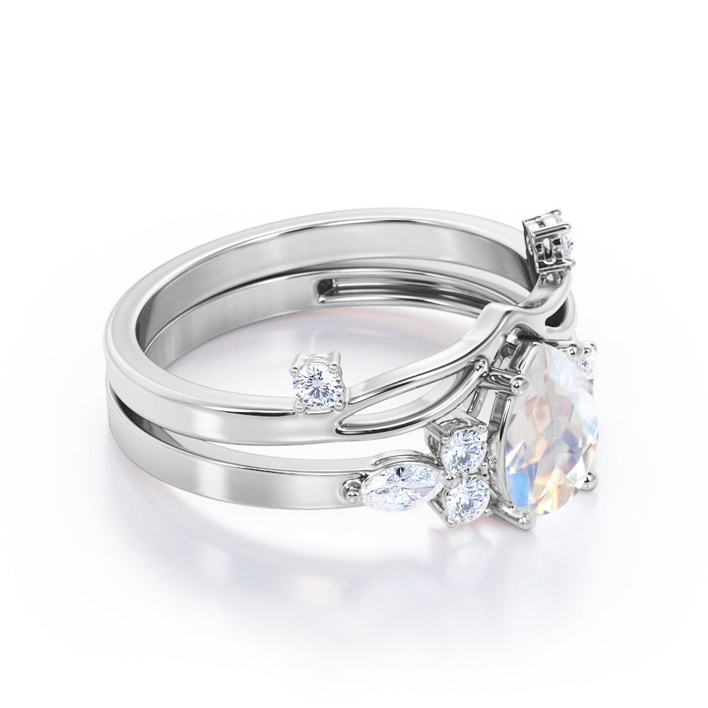 Elegant Art Décor 0.6 carat Pear Moonstone and Moissanite Wedding Ring Set in Rose Gold