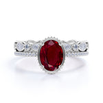 Elegant Antique Design 1.50 Carat Oval Cut Lab Ruby and Diamond Wedding Ring Set with Art Deco Band in White Gold