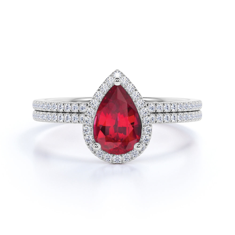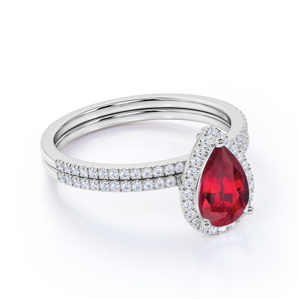 Elegant Pave 2 Carat Pear Shape Lab Ruby and Diamond Halo Wedding Ring Set in White Gold