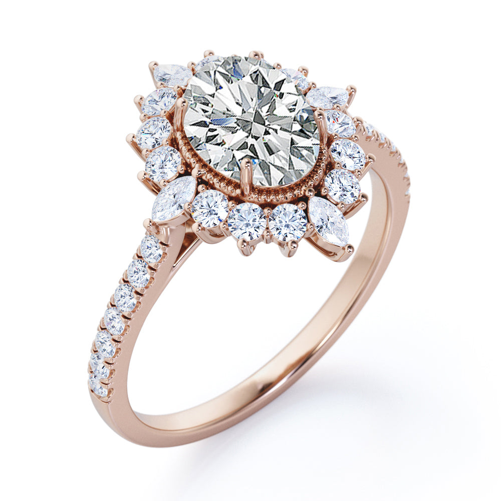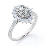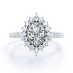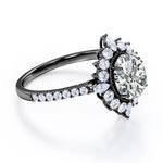 Either it's your anniversary, her birthday or any special event, this Enchanted Classic Milgrain Halo 0.8 carat Oval Moissanite and Diamond Engagement Ring in Black Gold will make your occasion more special. The shimmering Moissanite engaging ring displays a 0.5 carat oval Moissanite and encompassed by Milgrain halo in the middle layer and edged by round Moissanite oval halo. The accent is composed by different sizes of round Moissanite and the prong make the halo looks more vintage while the band is garnished by paved round diamond. the ring can be made in 18k gold over silver, 10k gold, 14k gold with the color of white gold, rose gold, yellow gold and black gold.