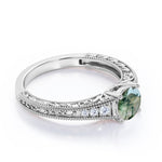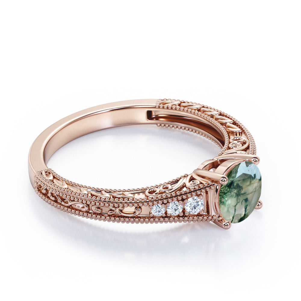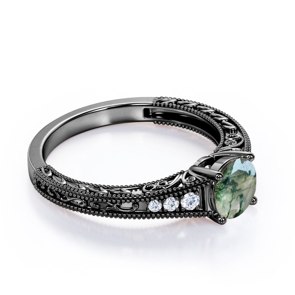 Either it Is your anniversary or a special event of your love one, this Estate-inspired 1 carat Round Moss Agate Art Decorative Anniversary Ring in White Gold could be a good choice for you. 0.75 carat green Moss agate is set by the top of the engagement ring. It green colors that is embed within, illustrating a unique pattern in each stone, you can be sure that your gift will look different from other vintage jewelry. Tapered band boats 3 round Moissanite on each site, in total carat weight of 0.25 carat. Promise ring's band is decorated with nature-inspired Filigree and Milgrain; swirling scroll pattern illustrates the wind blow and leaves that are floating in the air. This alternative engagement ring is available at an affordable price, it can be purchases as an anniversary gift, mother's day gift or even a gift for yourself. This antique ring come in the colors of white gold rose gold, yellow gold and black gold. You can also choose either 18k gold over silver, 10k gold, 14k gold and 18k gold for the band.
