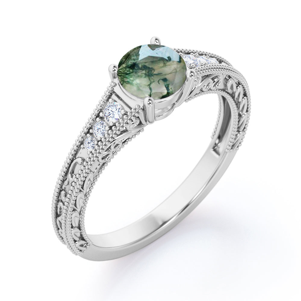 Estate-inspired 1 carat Round Moss Agate Art Decorative Anniversary Ring in White Gold - Mother's day, Birthday