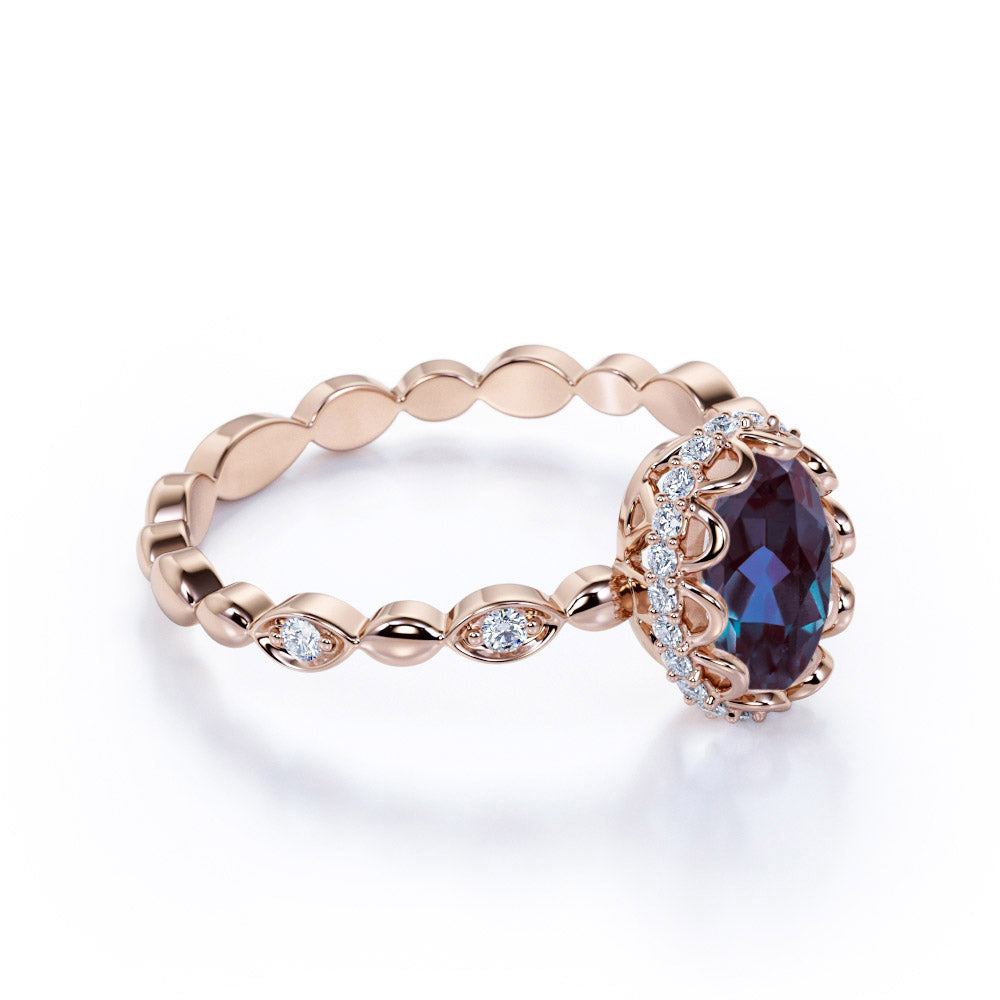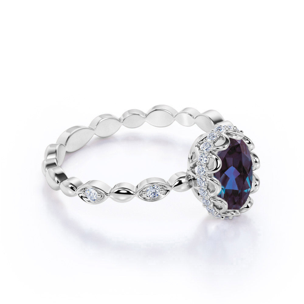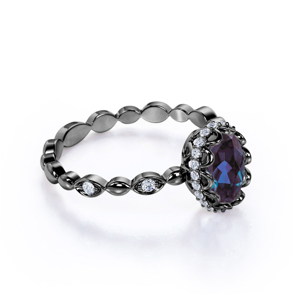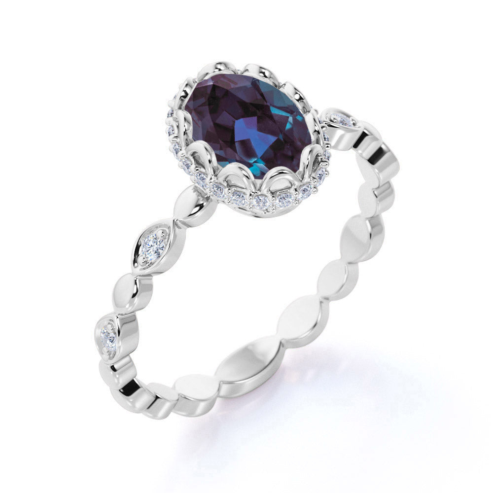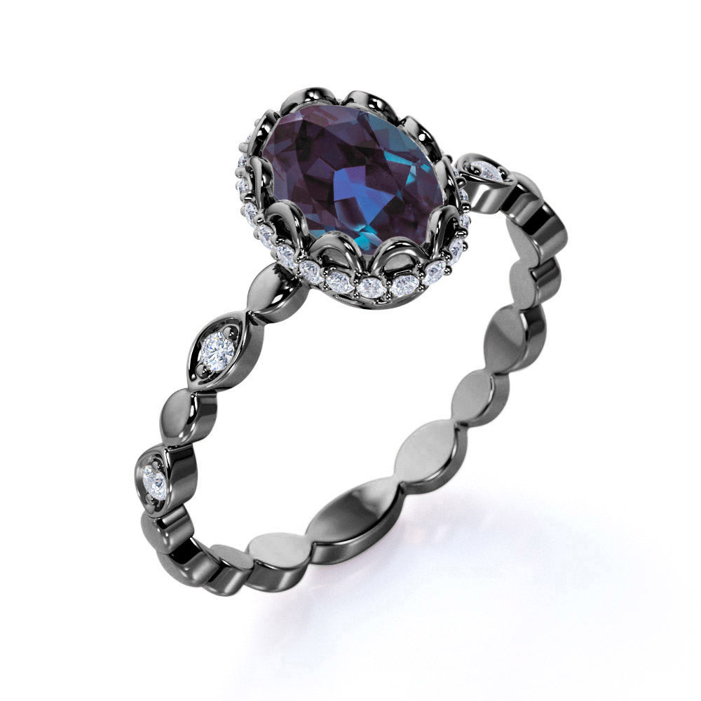 Be on cloud nine with this Eternity 1.25 Carat Oval Cut Lab Grown Alexandrite and Diamond Hidden Halo Beaded Engagement Ring. This ant nouveau ring features 1 carat oval cut lab grown Alexandrite and .25 carat real genuine side diamond for gold ring and moissanite for silver ring. This classic engagement ring can be customized to either 10k, 14K and Gold over Silver and either Black Gold, Rose Gold, White Gold or Yellow Gold. Also, as your satisfaction is our most priority, we will do our best to have your handmade jewelry be carefully and beautifully crafted by our expert jewelers. The order also comes with a 30-day full refund policy. Perfect for any occasion, this flawless artificial Alexandrite ring can be an ideal gift for anniversary, birthday, proposal, Christmas, Valentines, mother's day and more. With its unique ability to exhibit two colors, this ring will make you stand out from others. If you are looking for the encouragement to love and romance, this ring is right for you. Enrich your charming love story and strengthen your bond with this color-change man made Alexandrite ring. This simulated Alexandrite ring gives a vivid grass green color in daylight and displays an intense raspberry red in candescent light. This flawless simulated Alexandrite ring will be a perfect match for those who are looking for beautiful, classic, vintage and antique synthetic Alexandrite pieces of fine jewelry. This ring will surely complement every style of its wearer. Design and create your very own unique ring that makes you outstanding from the rest! Those who has a penchant for vintage and flawless ring would completely fall in love with this affordable synthetic Alexandrite ring. With its mesmerizing color-change variety and unparalleled vibrancy, this flawless lab grown Alexandrite ring will enchant your special someone with gracefulness.
