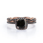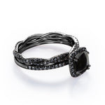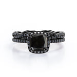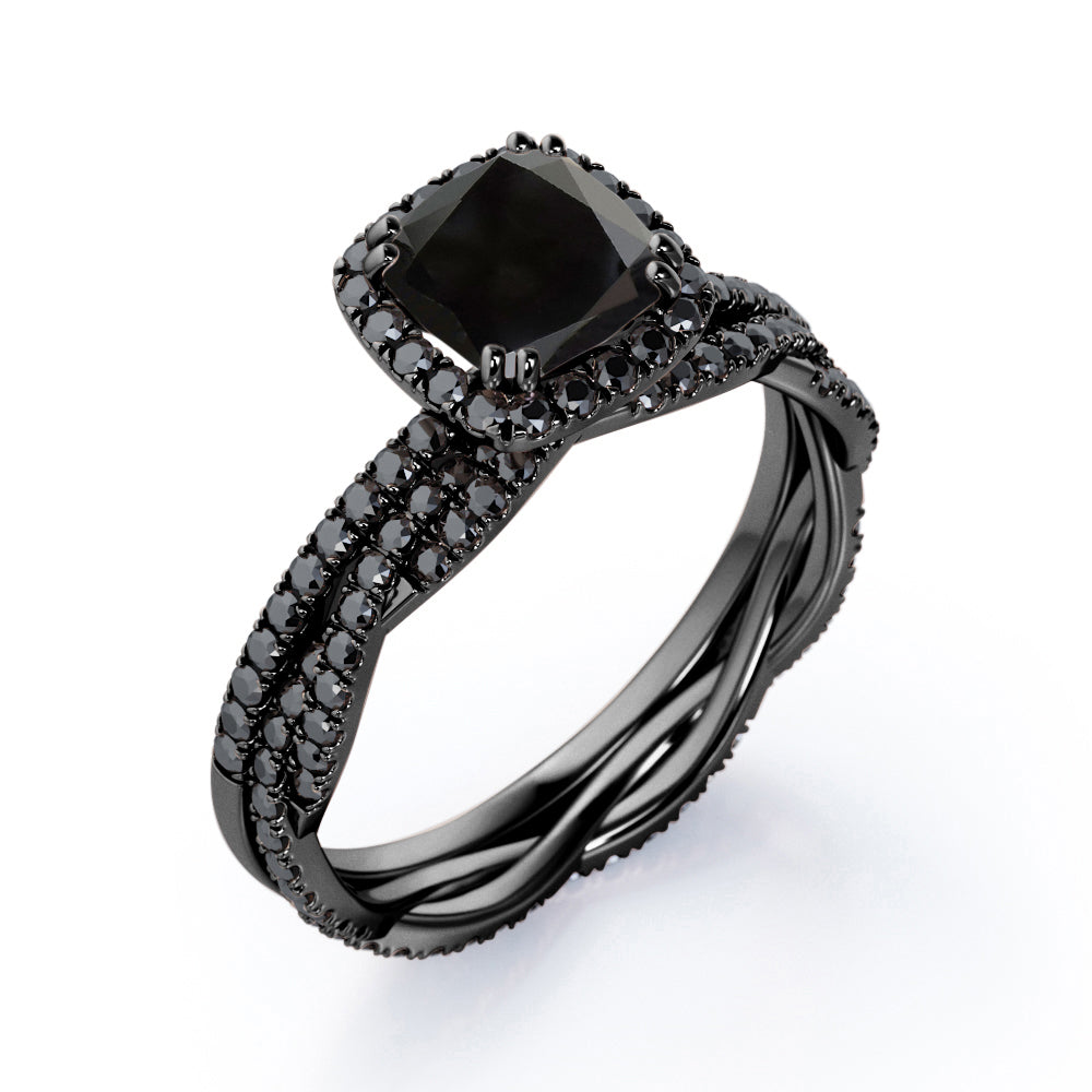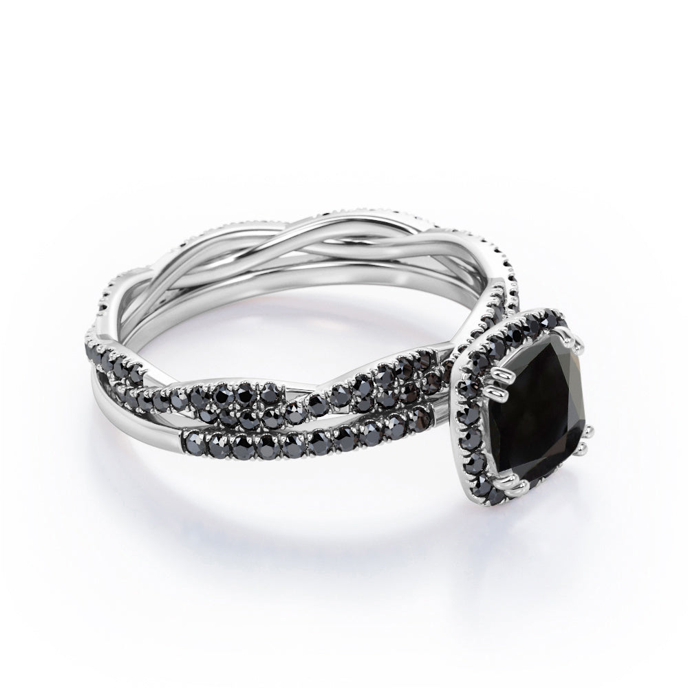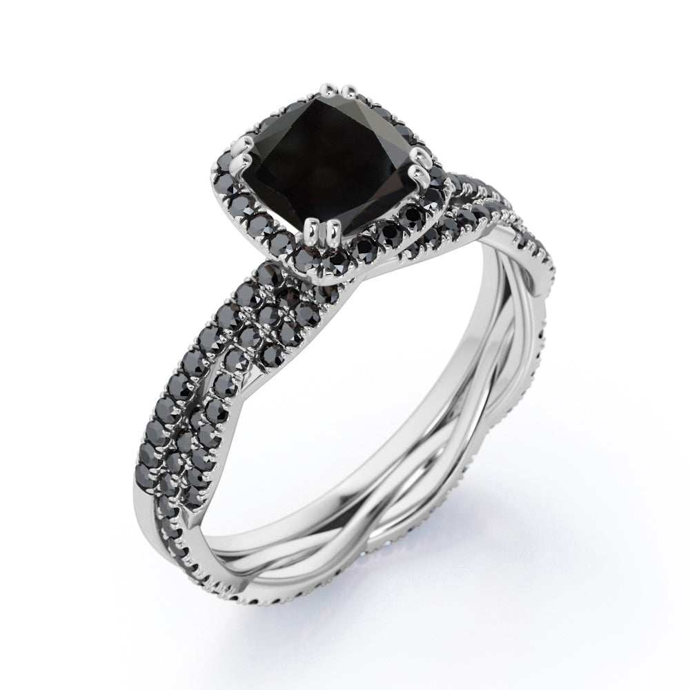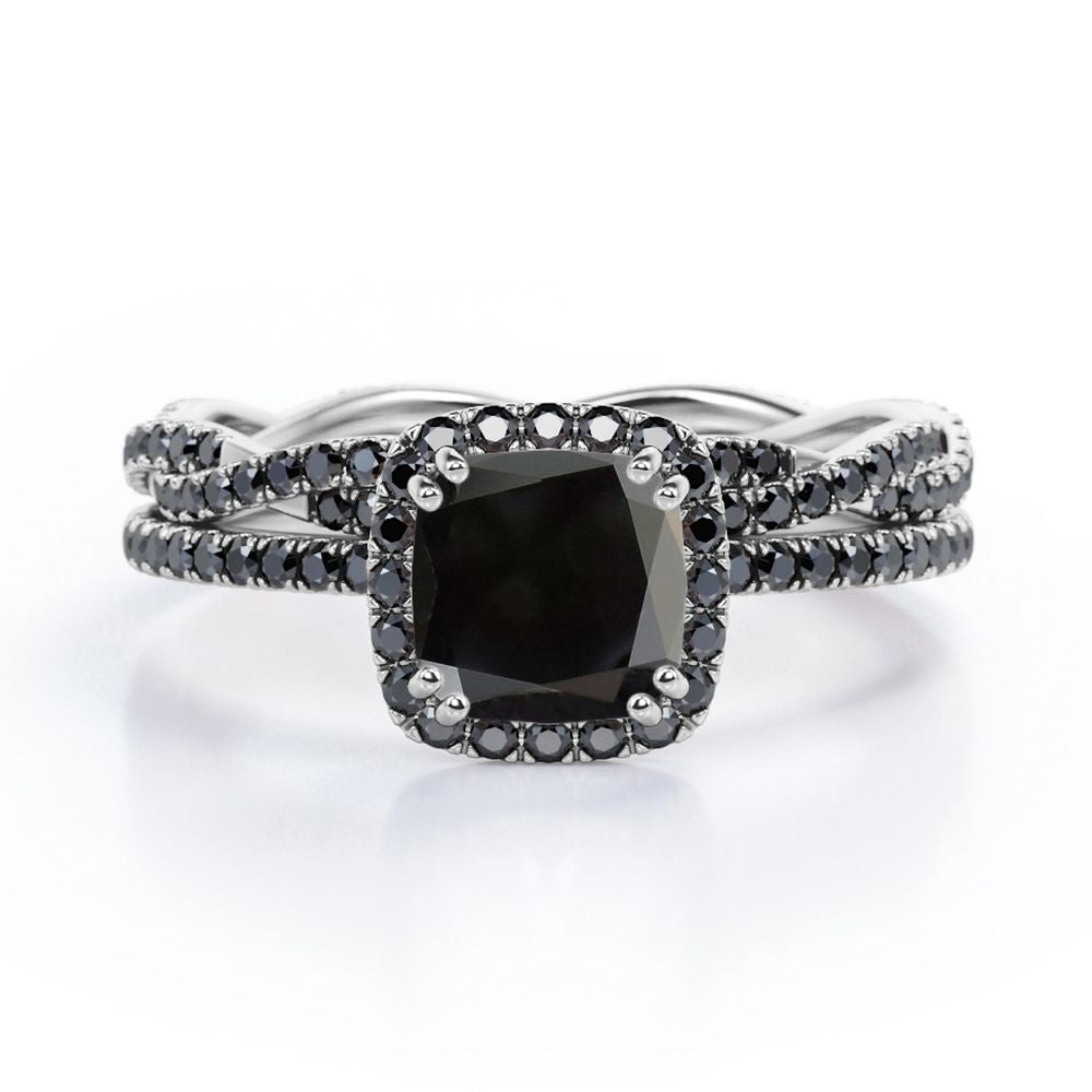 Make someone you love feel amazed by the brilliance of this Eternity Crossover - 1.75 TCW Cushion Cut Lab Created Black Diamond - Halo Pave Setting Wedding Set in White Gold. Skillfully hand-cut into a nice cushion cut by our experts in lapidary, this beautiful black diamond jewelry is composed of total 1.75 carat lab created black diamond on solid white gold. Special and non-traditional, this black diamond wedding rings set is perfect for those who would love to express their charisma and uniqueness. With its charming color, this synthetic black diamond ring set will unquestionably be an essential additional to any jewelry collection. This black diamond promise ring set is beautiful and accessible since it is available at a reasonable price. If you are in search of an incredibly romantic gift for your significant other, our black diamond wedding rings set, symbolically representing love, good fortune and creativity, will be the greatest choice you will ever make. Additionally, this black diamond rings set can be customized, so customers can choose one of metal colors between white gold, rose gold, yellow gold or black gold in 10k and 14k gold metal options. Let's fulfill your love story with this black diamond wedding rings set and she will be eternally joyful.