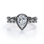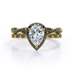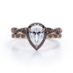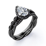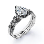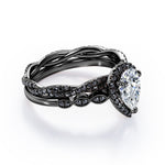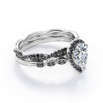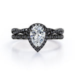 Be highly fashionable with this Eternity Crossover 1.75 TCW Pear Shaped Moissanite with Lab Created Black Diamond Halo-Vintage Style Wedding Ring Set in White gold. Professionally handcrafted into a fine pear cut by our skilled jewelers, this alluring silver moissanite engagement rings set features total 1.75 carat moissanite and lab-created black diamonds. Special and non-traditional, this moissanite wedding band set is well-suited for those who are not quite into normal lifestyle. With naked eyes moissanites look, shine and feel exactly like diamonds. With its splendor, this moissanite stone ring set will enhance happiness and attract positive vibes. This sterling silver moissanite wedding rings set is beautiful and accessible since it is available at a reasonable price. Moissanites are the most popular alternative gemstone for diamonds while being at lower and more affordable price. If you are looking for a special gift for your friends or your better half, this moissanite band set can be a good choice for any special occasion, i.e. a birthday ring, an engagement or marriage proposal ring, a Valentines' day ring, etc. Additionally, this moissanite engagement ring set can be customized, so customers can choose one of metal colors between White gold, rose gold, yellow gold and black gold in 18k Gold over Silver, 10k and 14k gold metal options. In regards to its hardness, moissanite is almost as hard as diamond which means that it is notably durable. Let's fulfill your love story with this best moissanite ring set and, surely, she will not regret it.