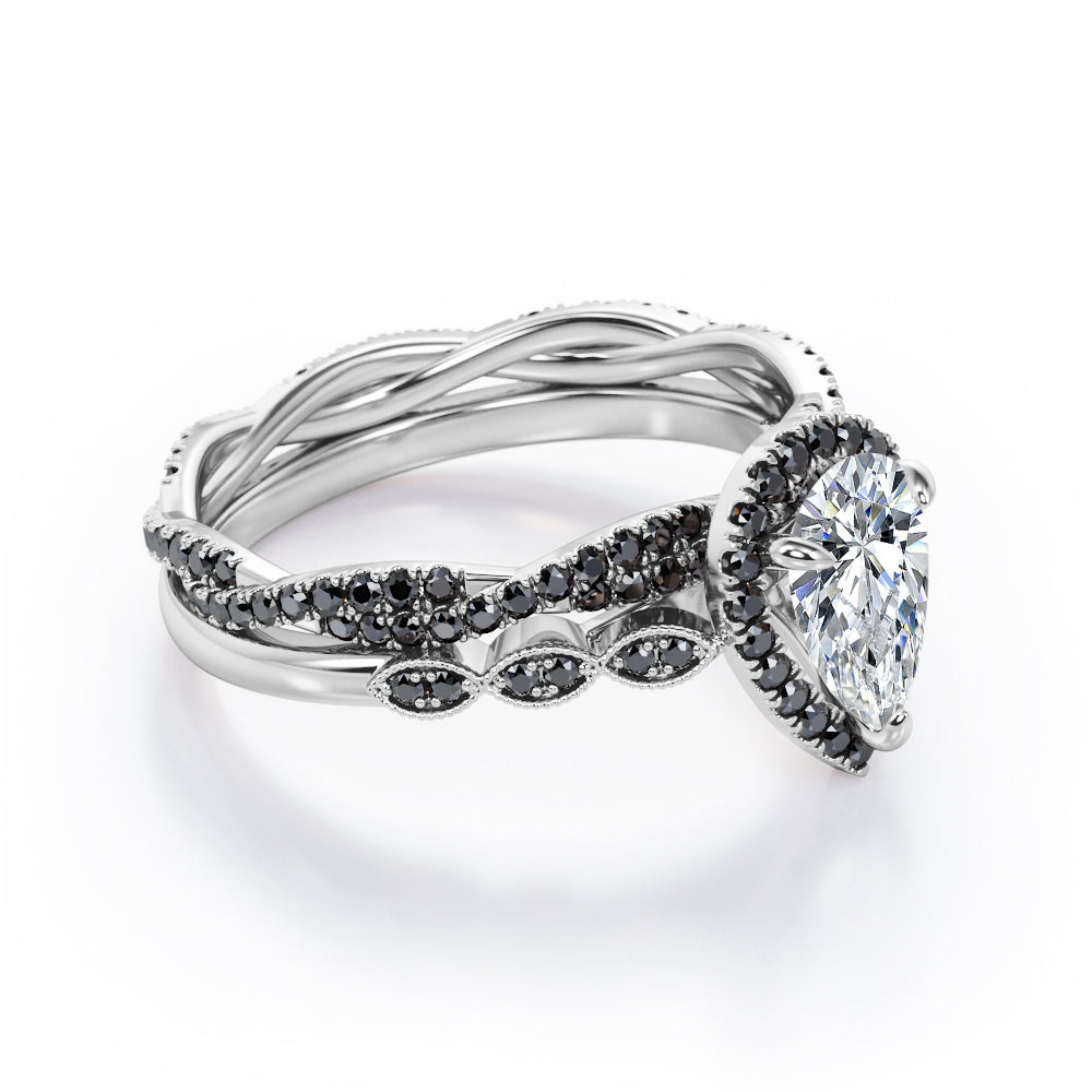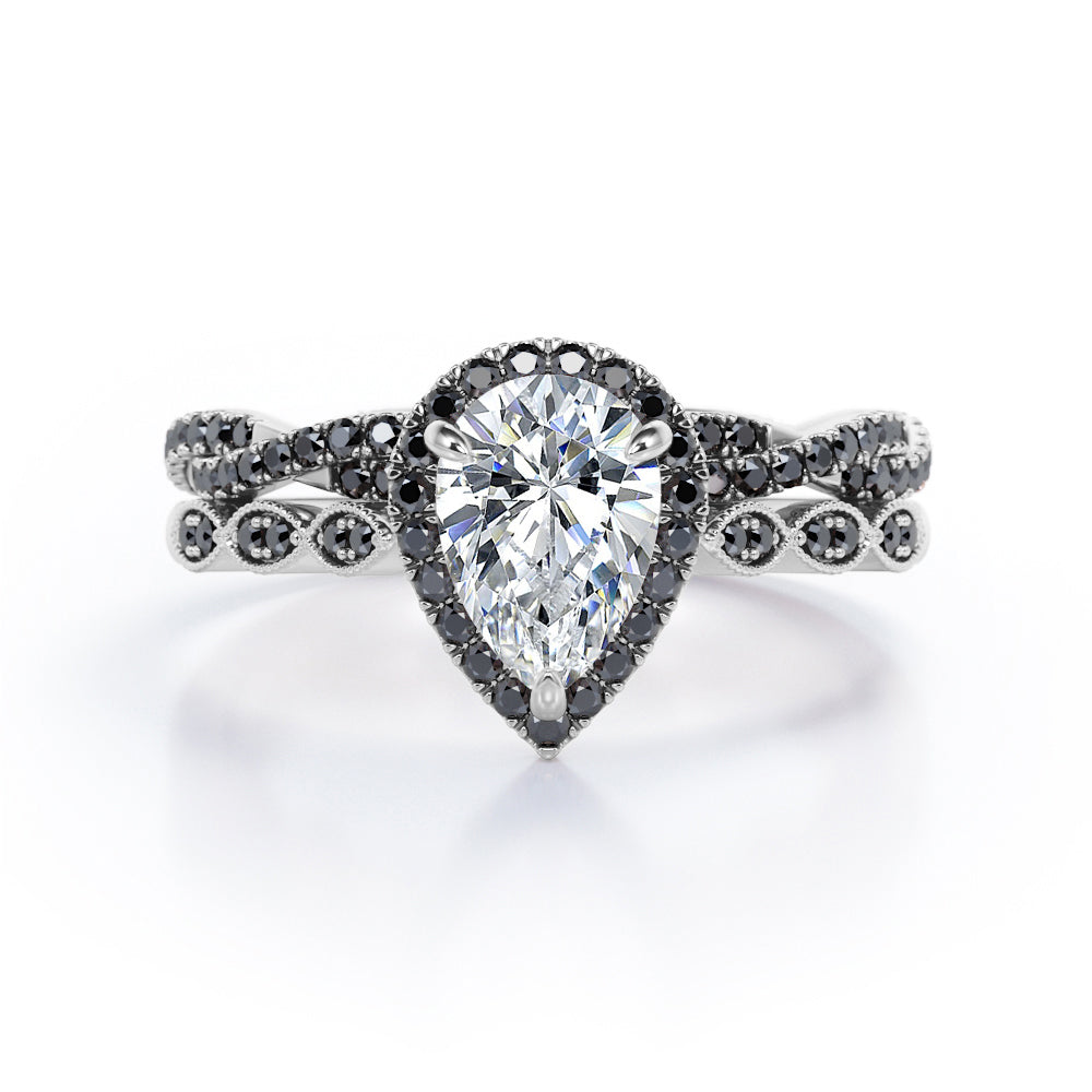 Eternity Crossover 1.75 TCW Pear Shaped Moissanite with Lab Created Black Diamond Halo-Vintage Style Wedding Ring Set in White Gold