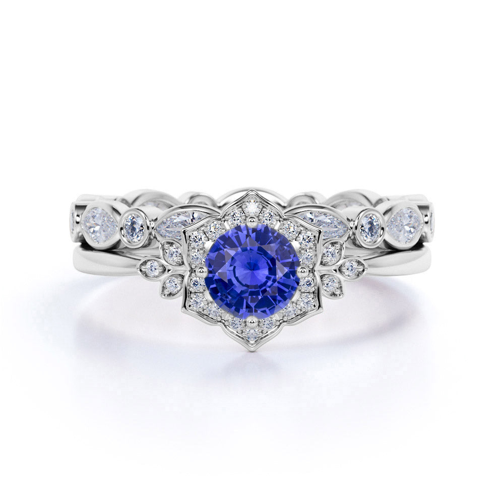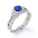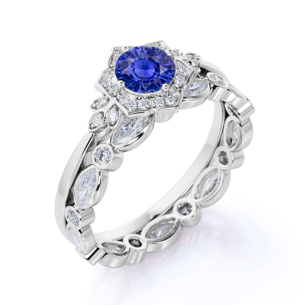 This is an antique flower design 2.25 Carat Round Cut Sapphire and Diamond Halo Wedding Set with Eternity Band in White Gold. The floral halo cluster design wedding set features 1.25 carat round cut sapphire in the center, surrounded with 1 carat of diamonds, for a total carat weight of 2.25 Carats. The sapphire wedding set can be made in either Rose, White or Yellow Gold, and can be customized to your choice of 10k, 14k or 18k Gold. As always, the order comes with jewelry certificate and 30 days full refund policy.
