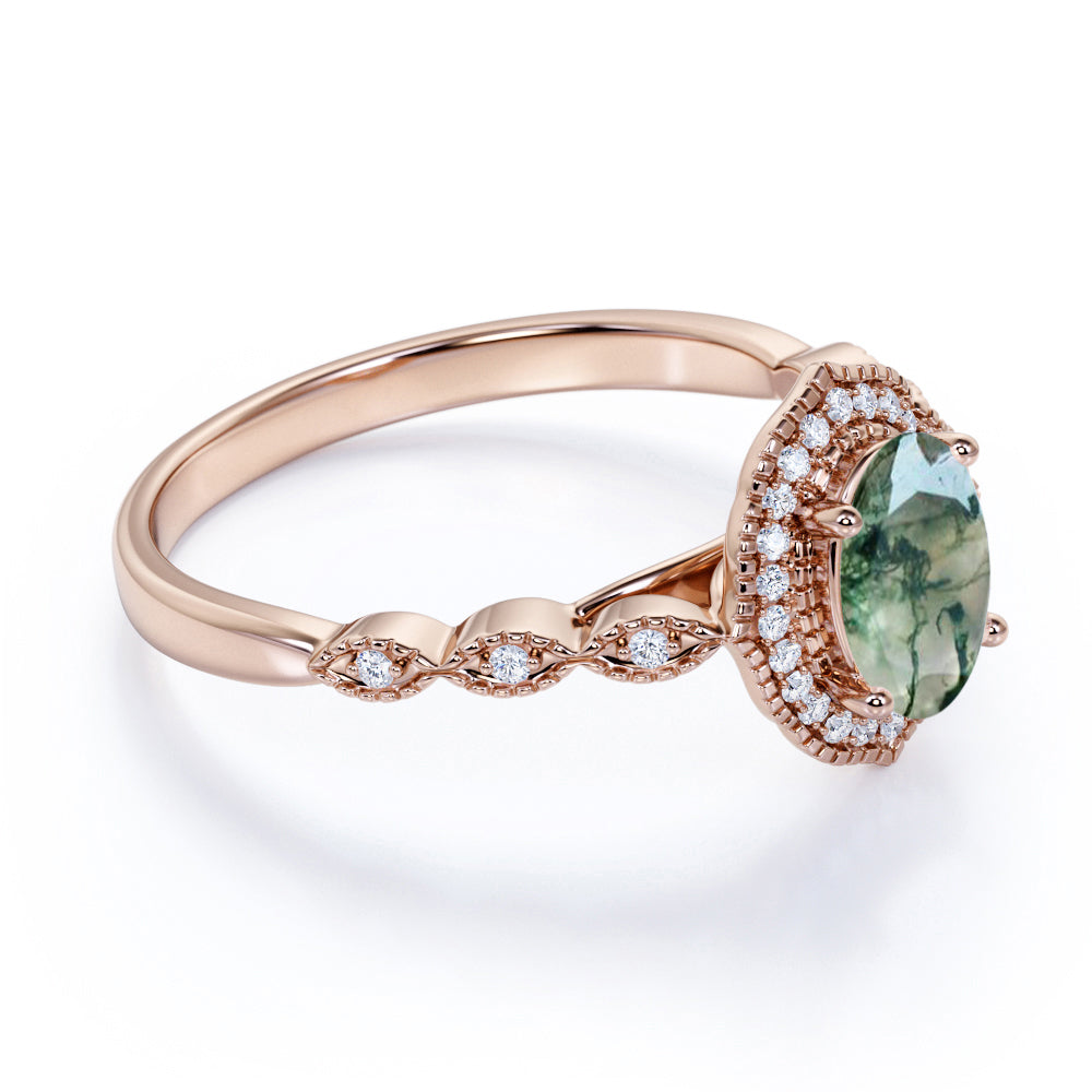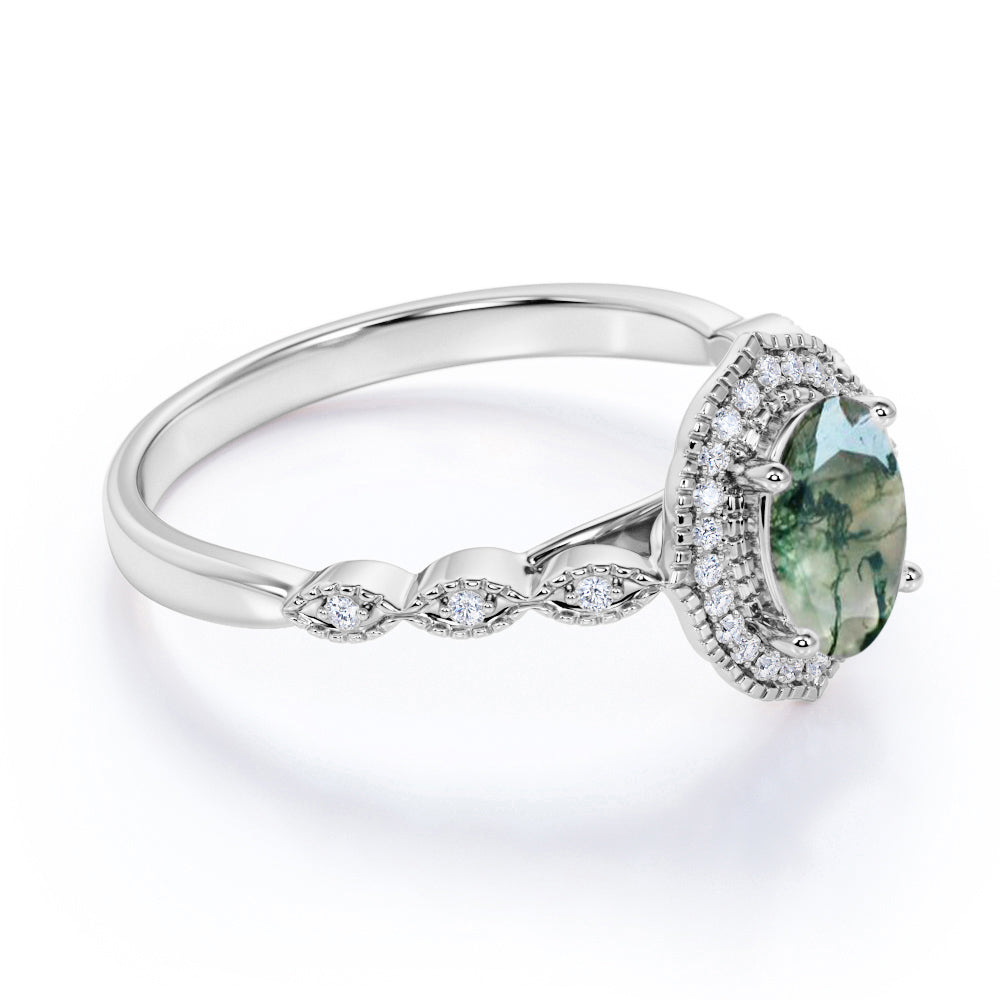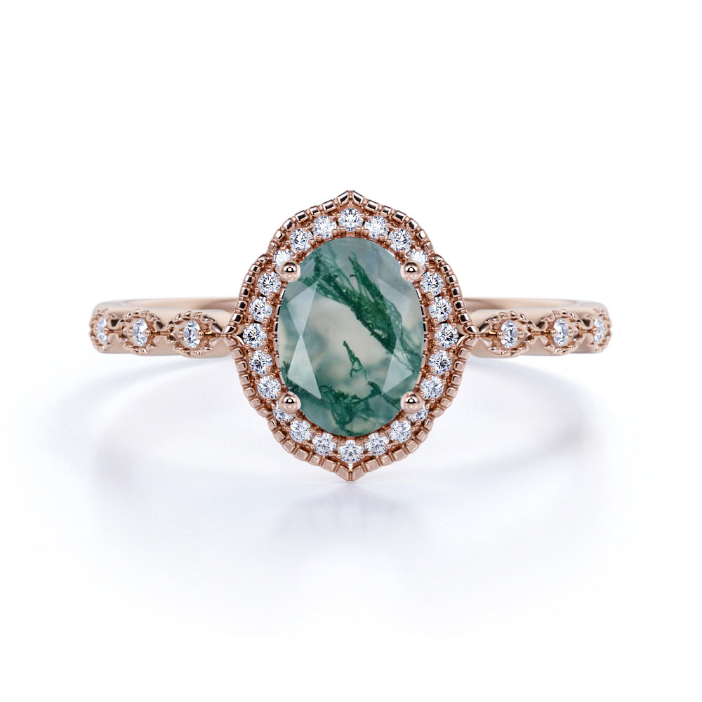 Vintage Halo 1.50 Carat Oval Cut Moss Agate Ring