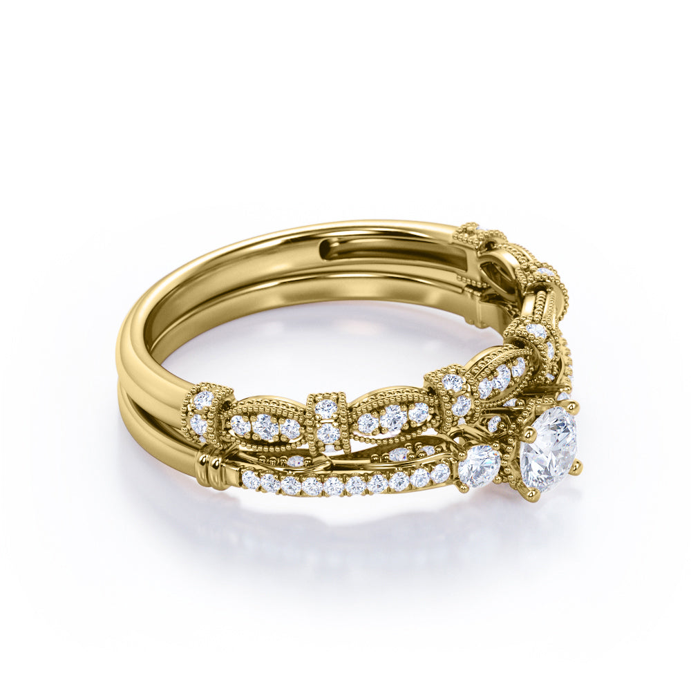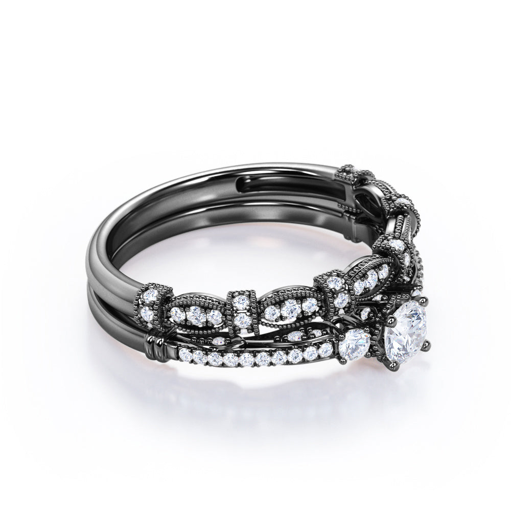 You might not be able to collect a star from the sky for her but you can promise her with this Fashionable 1.25 carat Round Moissanite and Diamond Bridal Ring Set in White Gold - Proposal Ring. The vintage-inspired ring features 3 stones Moissanite in different sizes, with petite diamonds stacked on half of the artfully crafted band. Moissanite was discovered years ago, in a crater created by a meteorite that fell to Earth so it's considered a star. It's aglow and even more sparkle once it's paired with the fashionable bead detailing wedding band. Marquise band alternating with cylinder look Milgrain decor features round diamonds within. When you wear them separately, it will give you a different style. You can wear it everyday and switch between these two exceptional rings, you can match with any other jewelry or any outfits. Make everyday feel like Christmas and gift your love one with these Art Deco rings.