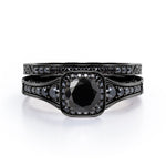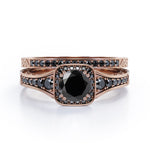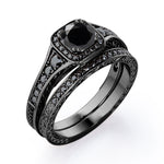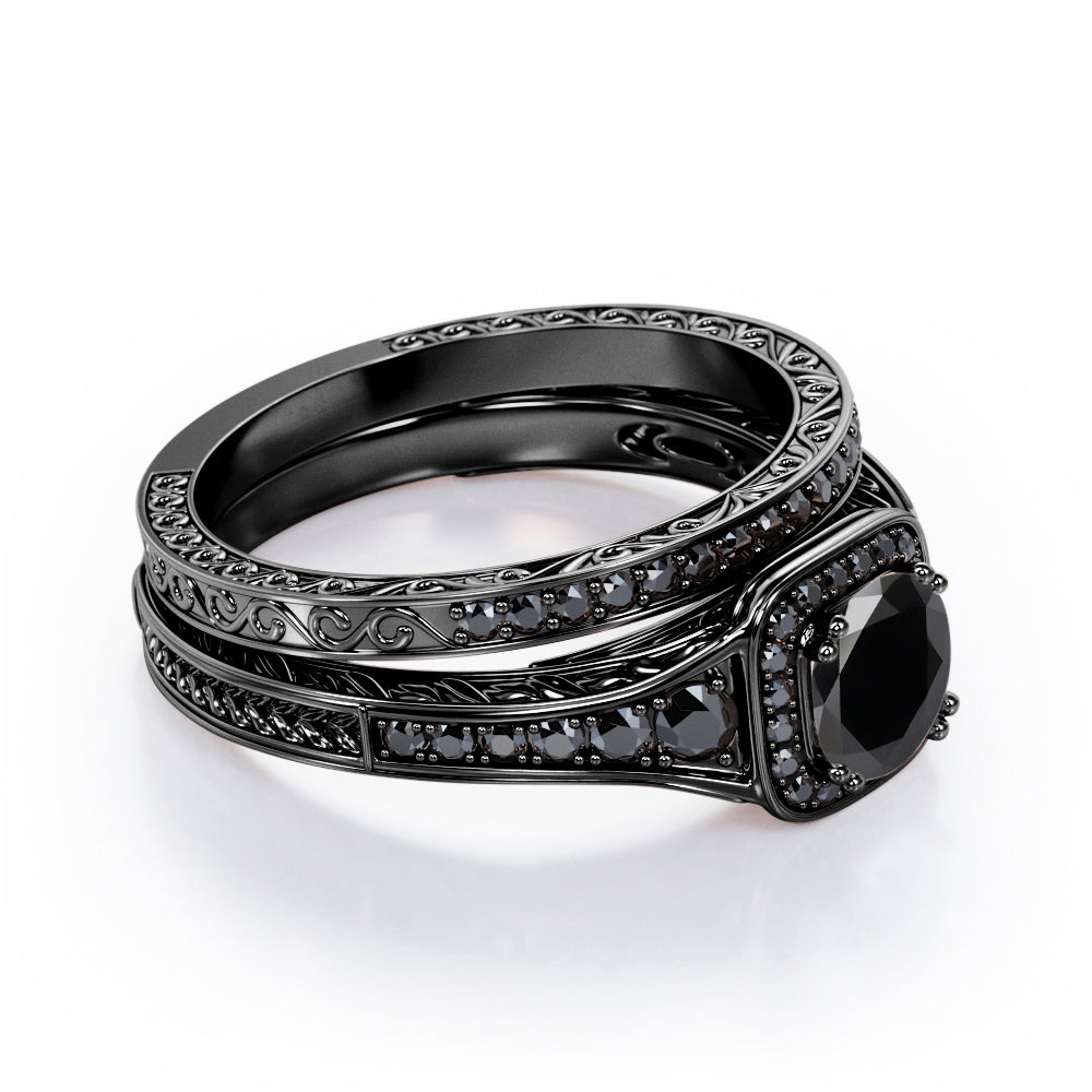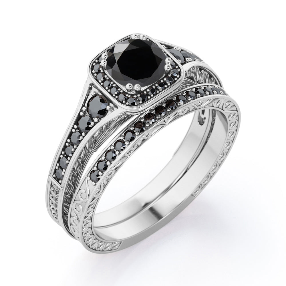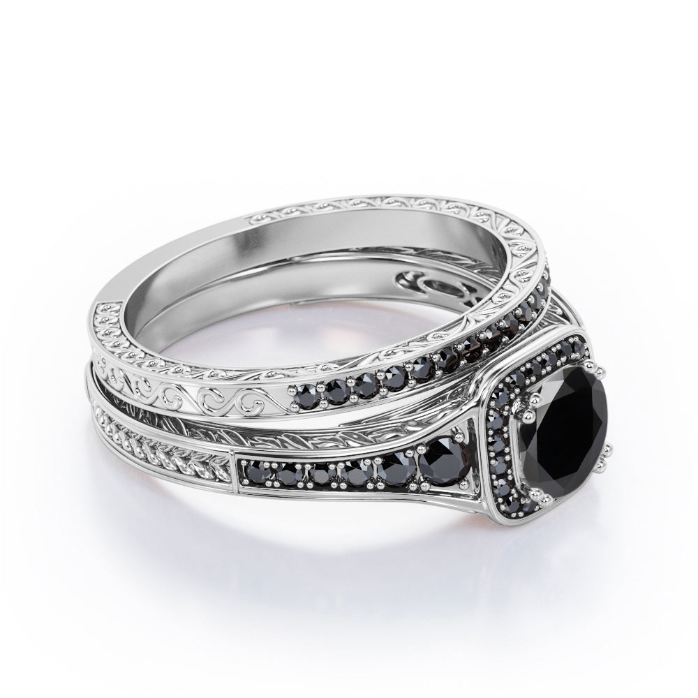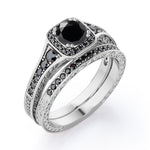 Make someone you love feel amazed by the brilliance of this Filigree Pave Channel 1.6 TCW Round Lab Created Black Diamond Double Prong Cluster Wedding Set in White Gold. Professionally handcrafted into a fine round cut by our skilled jewelers, this flawless black diamond ring set features total 1.6 carat lab created black diamond on solid white gold. Distinctive and extraordinary, this black diamond ring set is well-suited for those who are not quite into normal lifestyle. Reflective properties of this black diamond stone engagement ring set will absolutely enhance every style of its wearer. This black diamond engagement ring set is beautiful and accessible since it is available at an affordable price. This black diamond engagement ring set, symbolically representing love, good fortune and creativity, will be the greatest choice you will ever make. This black diamond ring set can be customized, so customers can choose one of metal colors between white gold, rose gold, yellow gold or black gold in 10k and 14k gold metal options. Let's fulfill your love story with this black diamond anniversary band set and, surely, she will not regret it.
